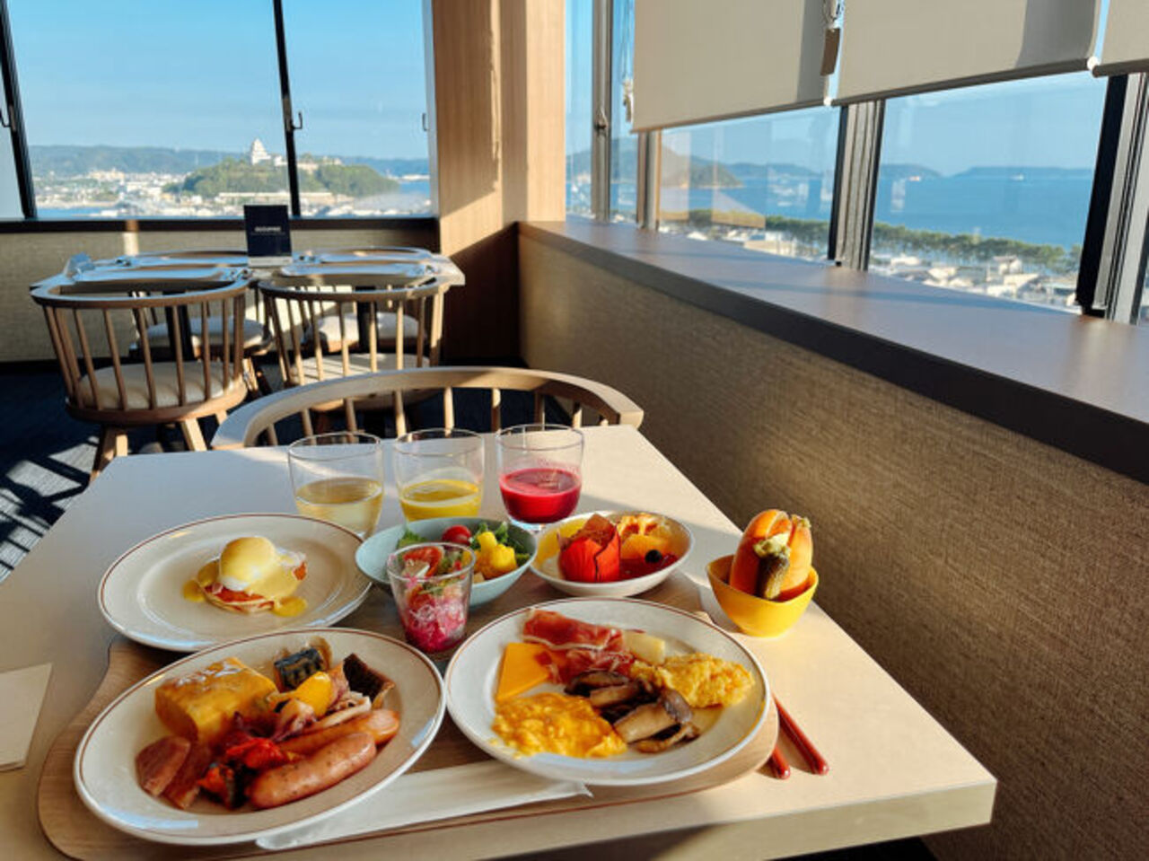 宿泊したシングルルームは海側ではありませんでしたが、川沿いの眺望が開けており唐津城を見ることもできました。海側であっても高層階でない限り、虹の松原を一望とは行かないようです。