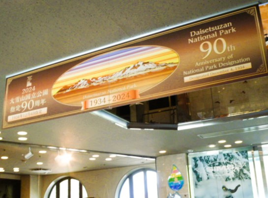 旭川市から高速道を通って、層雲峡温泉の[ホテル大雪]を探していたら`層雲峡駅`が,,層雲峡温泉の高い場所に! フロントで順番を待っていると`大雪山国立公園;90周年(1934年~2024年)`が ゆっくりの客室で眺望は柱状節理の断崖/黄色葉の木々が渓谷を☆ 温泉は大浴場は三つも;峡谷露天風呂/展望大浴場 大雪乃湯/欧風大浴場 チニタの湯;単純硫黄泉♪ 三つの大浴場に`湯めぐりラリー` 賞品は,,(内緒ですね)