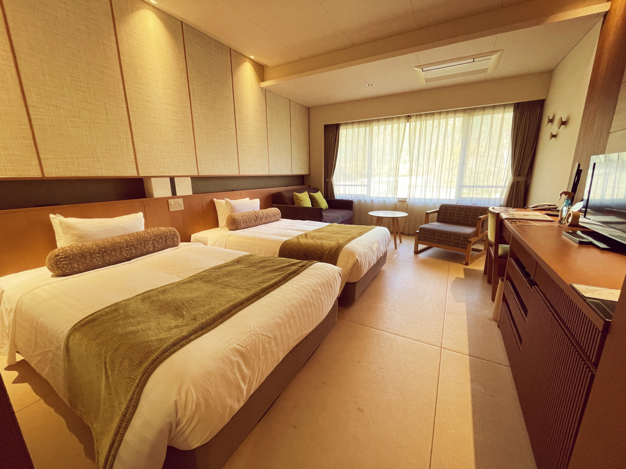 バスターミナルから徒歩10分弱、河童橋を渡ってすぐのところにあるホテルです。穂高連峰が見えるリニューアルツインルームに宿泊しました。元々は焼岳側で予約していましたが、前夜に空室があるのを見て急遽変更しました。(事前に問い合わせると、穂高眺望や穂高独占というお部屋しか良い眺望はないようで、部屋の指定や希望もできないと回答がありました)
