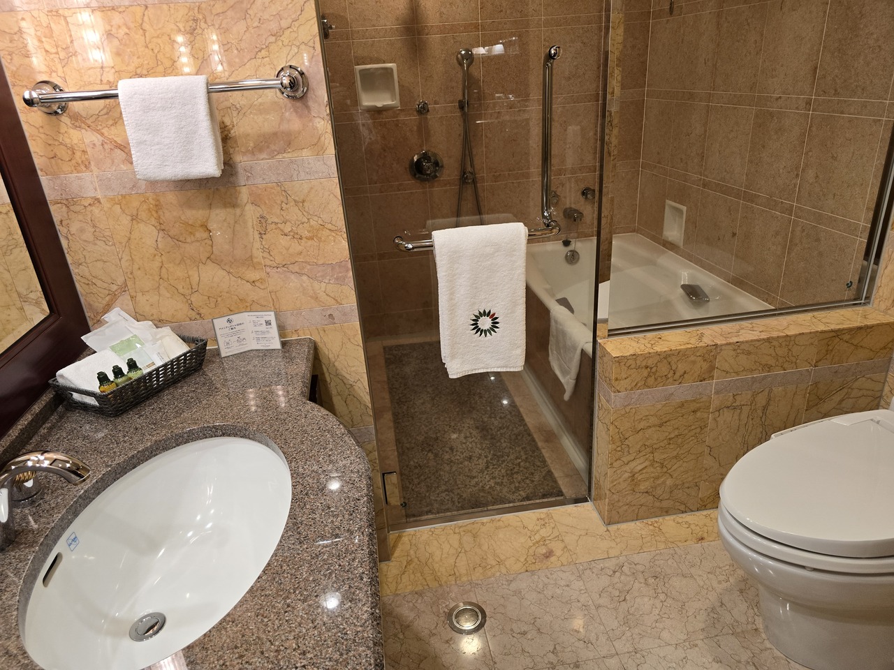 部屋は重厚な家具が置かれ30㎡以上の広さがある。特に良いのがバスルームで、浴槽とシャワーはガラス戸で別に洗面所と仕切られている。水圧も充分なお湯がサッと出て気持ちいい。アメニティはミニボトルでロキシタンだった。