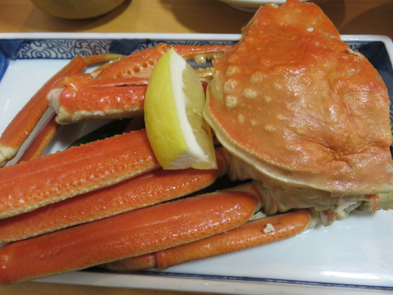 夕食は一人分ずつ船盛のお刺身 半分の松葉ガニ 但馬牛の陶板焼き 魚すき 先附 アンコウのから揚げ 茶碗蒸し デザート