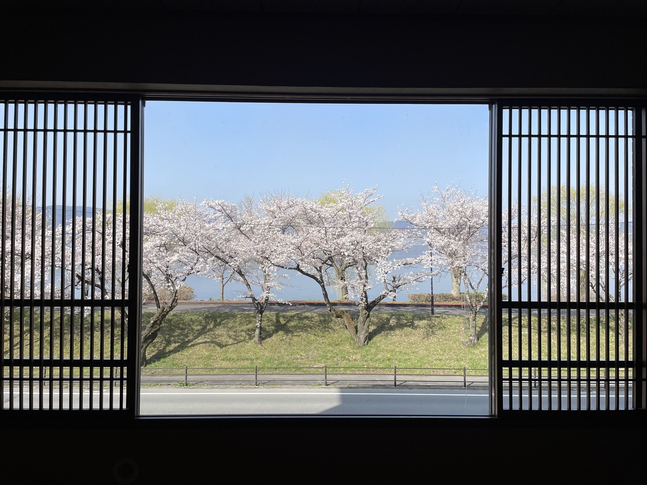 桜の季節に行ったので、部屋からも桜と湖が眺められました。
