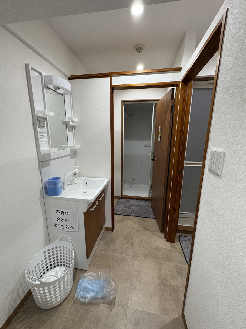 シャワー室が同階にあってキレイでした。サーモ付き水栓で便利だがワンタッチレバーで吐水が制限され少し不便でした