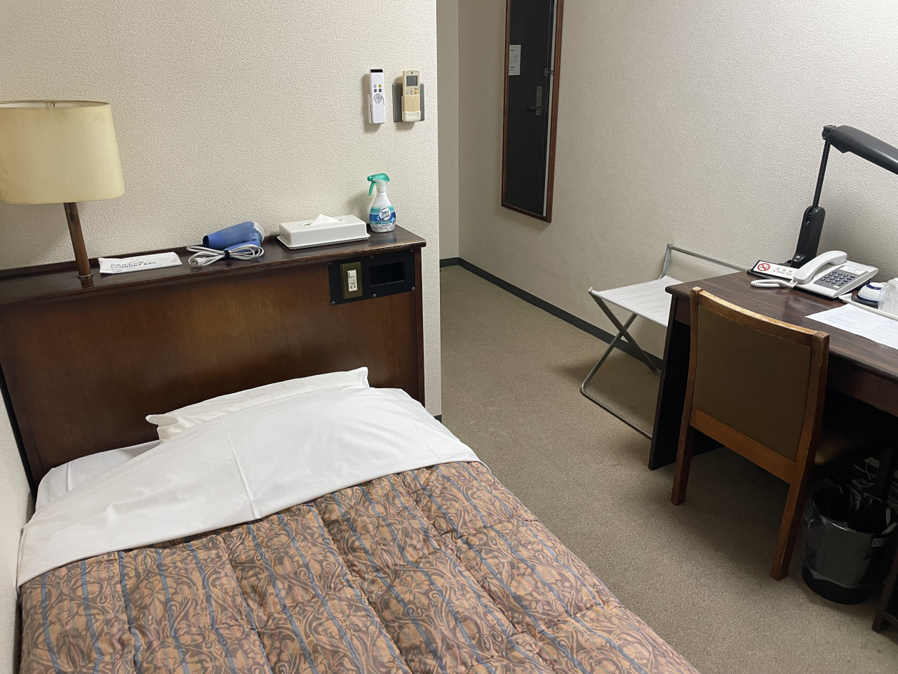 あまり新しい建物ではないが、コストパフォーマンスは高いホテルだ。宴会場を備えているので、このエリアの都市型ホテルの役割を果たしているのだろうか。部屋はWifiがあり、ネット環境に不自由はない。水回りなどは新しくはないが、宿泊費との見合いで納得がいくラインだ。一階ロビーのウエルカムコーナーに無料の焼酎があり、少し驚いた。