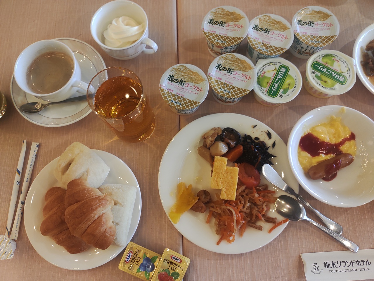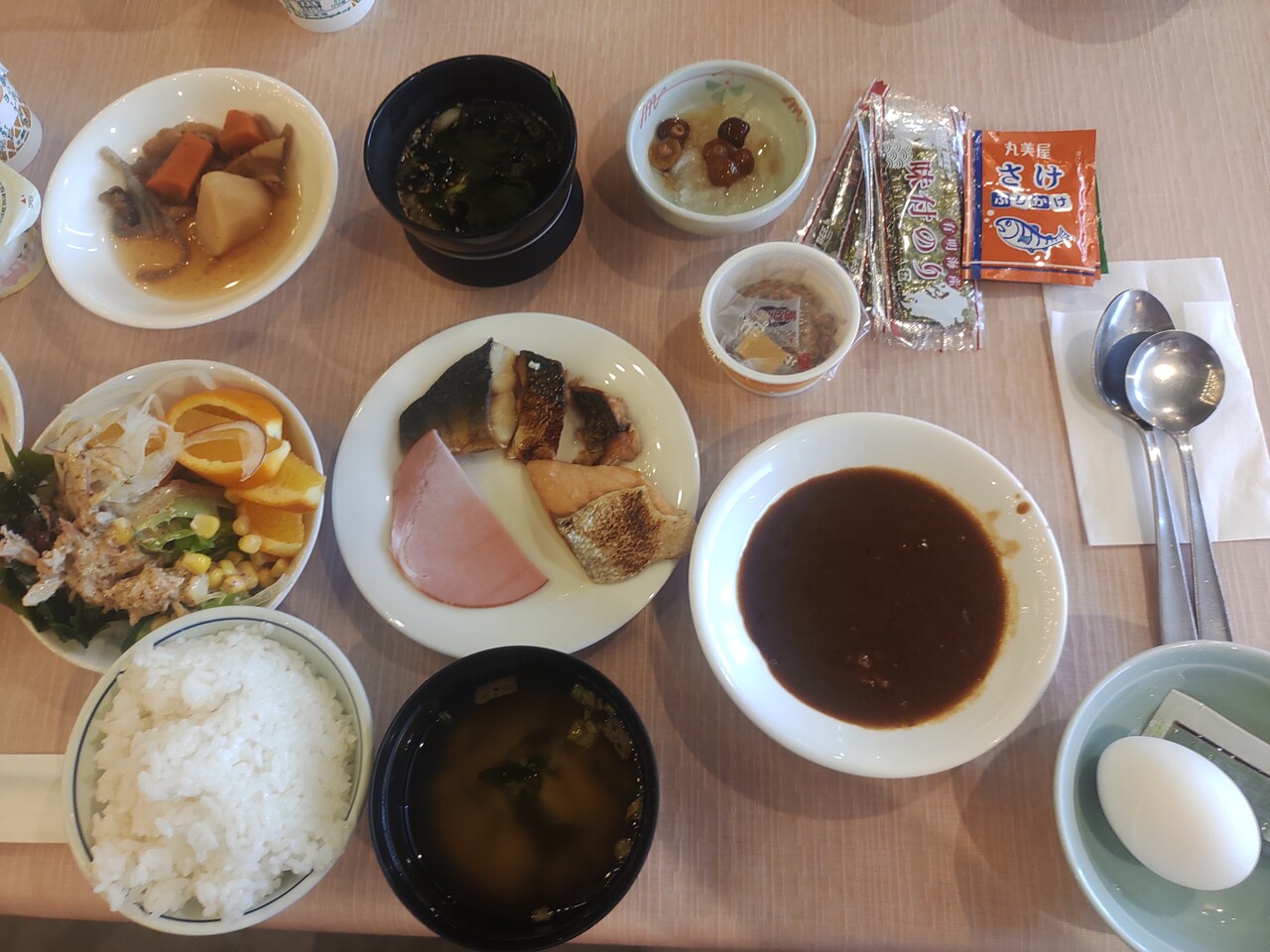 朝ごはんから、たくさんの種類の食べ物が並び、元気をいただけます。青りんごゼリーは昔の給食を思い出し、懐かしかったです。蔵の街ヨーグルトは、固めでしっかりしています。サラダもいろいろ、生のオレンジもあり、嬉しかったです。焼き魚もシャケとサバがありました。納豆や温泉玉子、ふりかけや味付海苔、ハム、玉子焼き、お味噌汁、パン、ソフトクリーム等、お腹いっぱいになりました。
