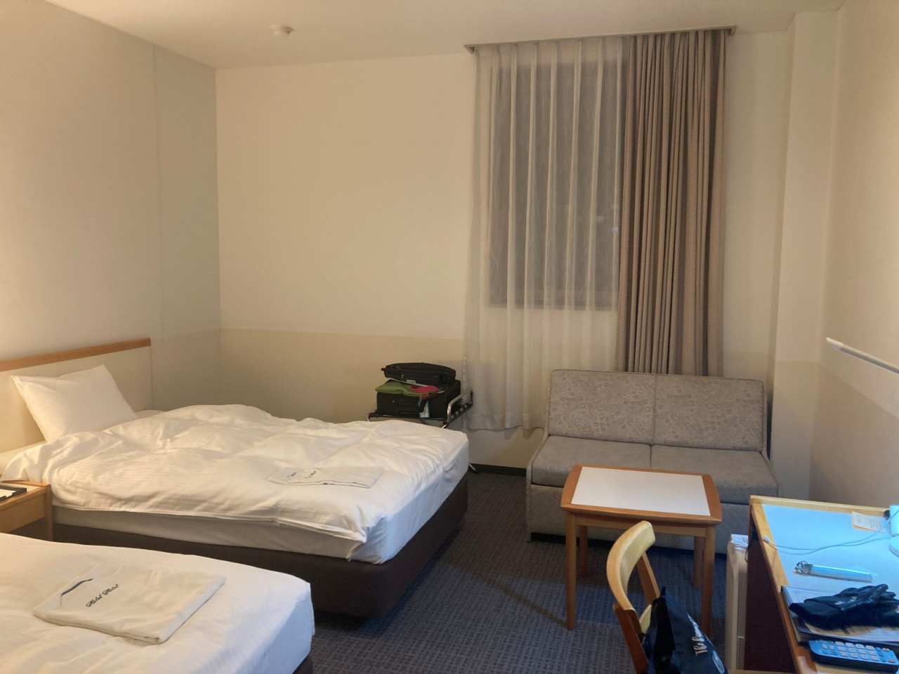 【部屋】広い。ツインで10000円以下なのにもかかわらず、幅広のベッドが余裕を持っておかれていて、小さいながら二人掛けのソファとテーブルまで置かれている。デスク、と椅子も別にある。バスルームもユニットバスながら広さは十分で、広さは北海道のおかげかな、と思う。