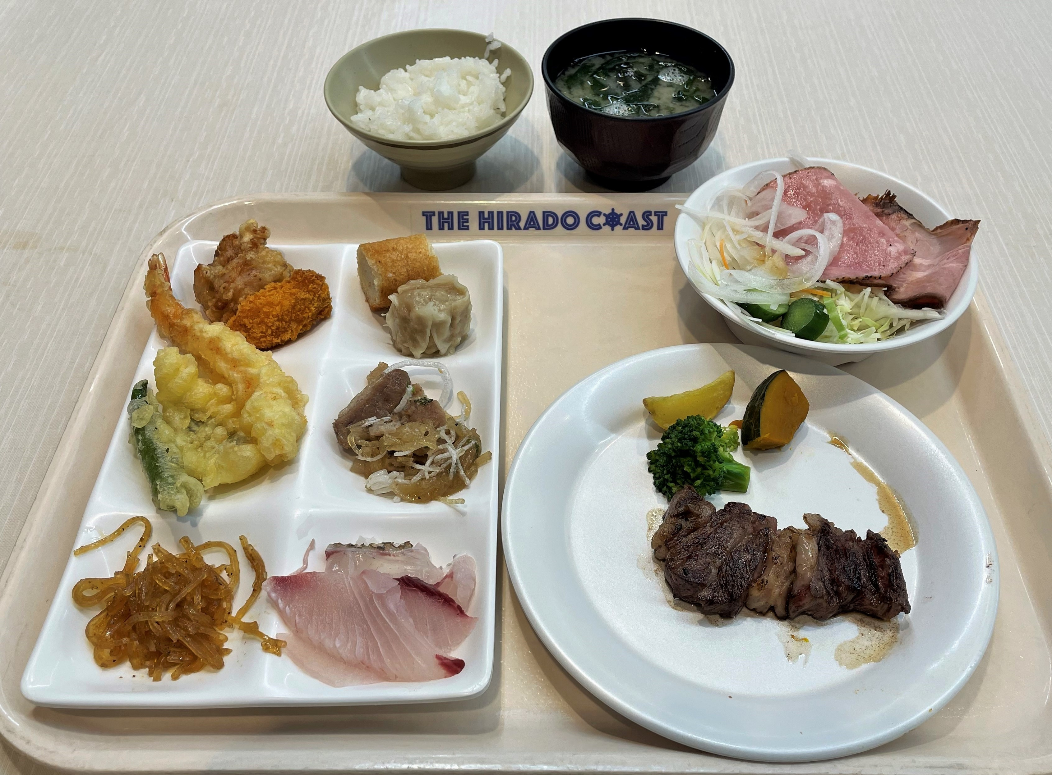 平戸でのお宿は「平戸たびら温泉 サムソンホテル」、180度大パノラマのオーシャンビュー、平戸産の新鮮な野菜と海産物のバイキング料理が自慢のお宿です。