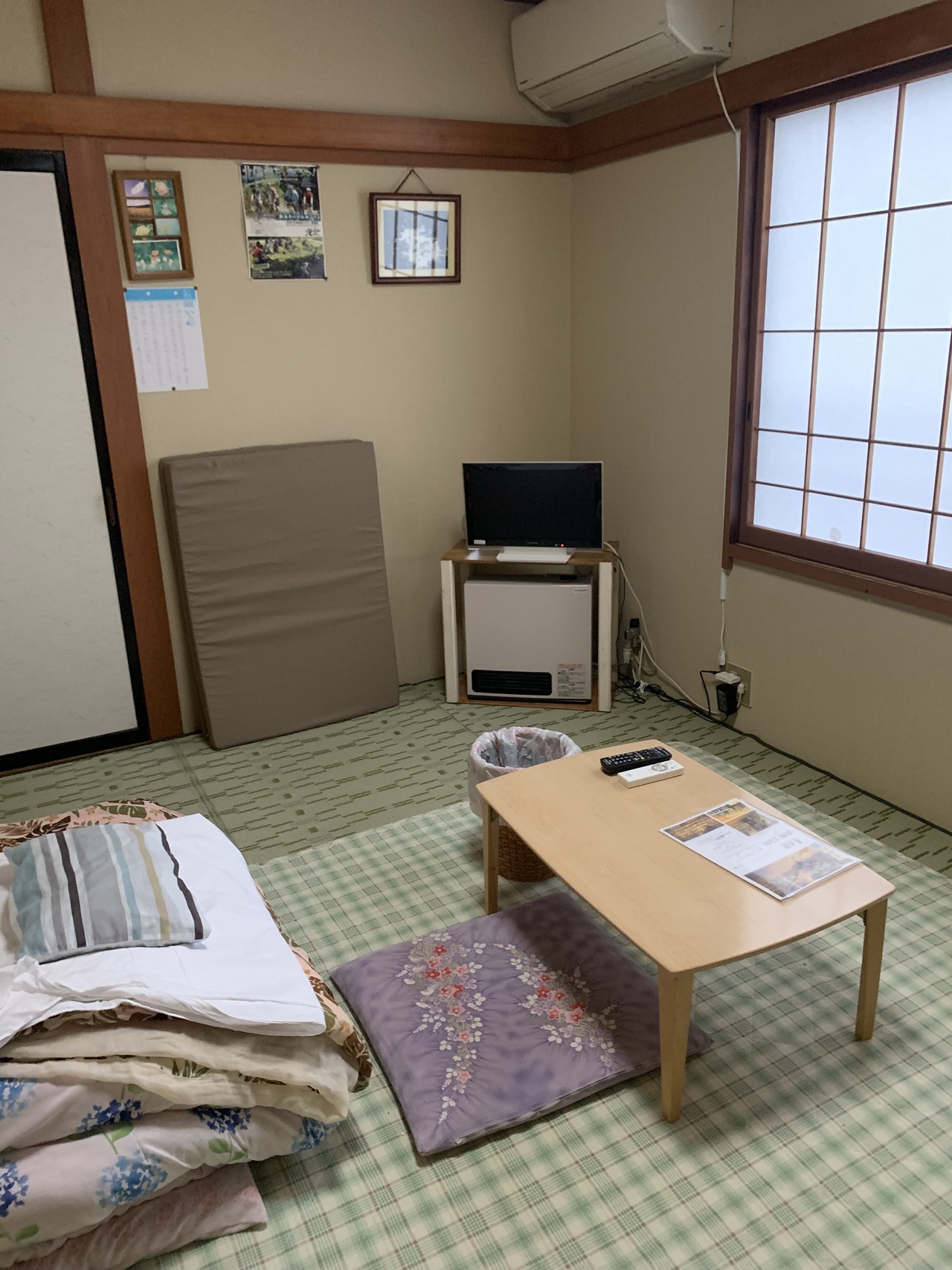 まず1番の利点は、バス停(新田ターミナル)から1分です。雪道をスーツケースを引きずりながら歩くのは至難の技です。わだち、水、凍った道では、近いのがありがたい。笑顔の女将さんと旦那さんがお出迎え、早く着いたので、着替えと荷物を置かせていただきました。題名通り、アメニティほかティッシュなど部屋内の備品は何もありません。布団も昔ながらの重たいタイプです。テレビ、エアコン、ストーブは完備。内湯も無いので、当然入湯税もいりません。地下にバーがありますが、下戸の私は利用しませんでした。少し飲めると良いのに。新しくなった立ち寄り湯もすぐ近くに、また食事のできる所、カフェ、土産物屋もあります。お安い値段で泊まれる民宿だということを理解の上、予約していただければ幸いです。