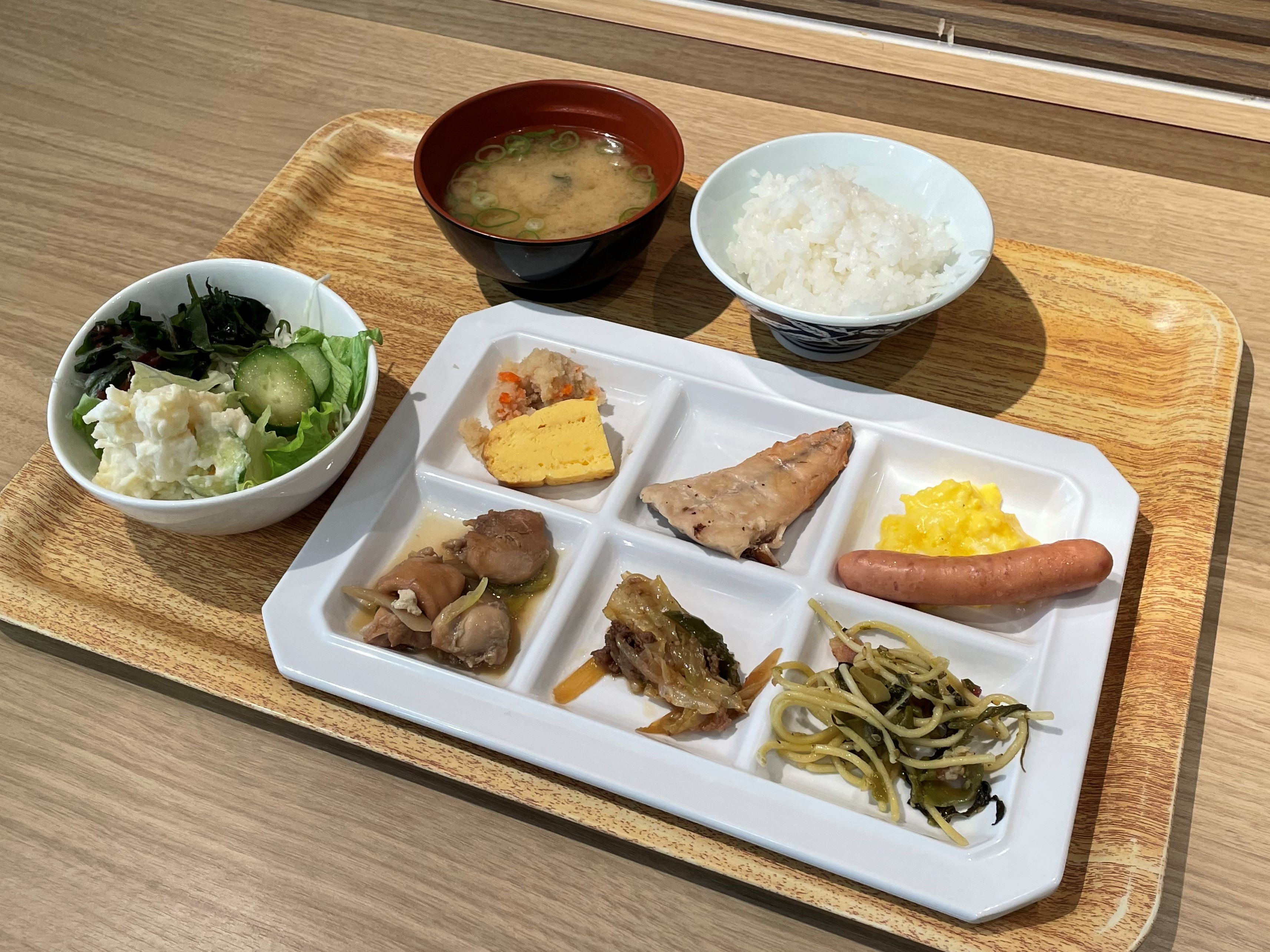 焼き魚やお惣菜も美味しいです、温かいお味噌汁も元気が出ます。