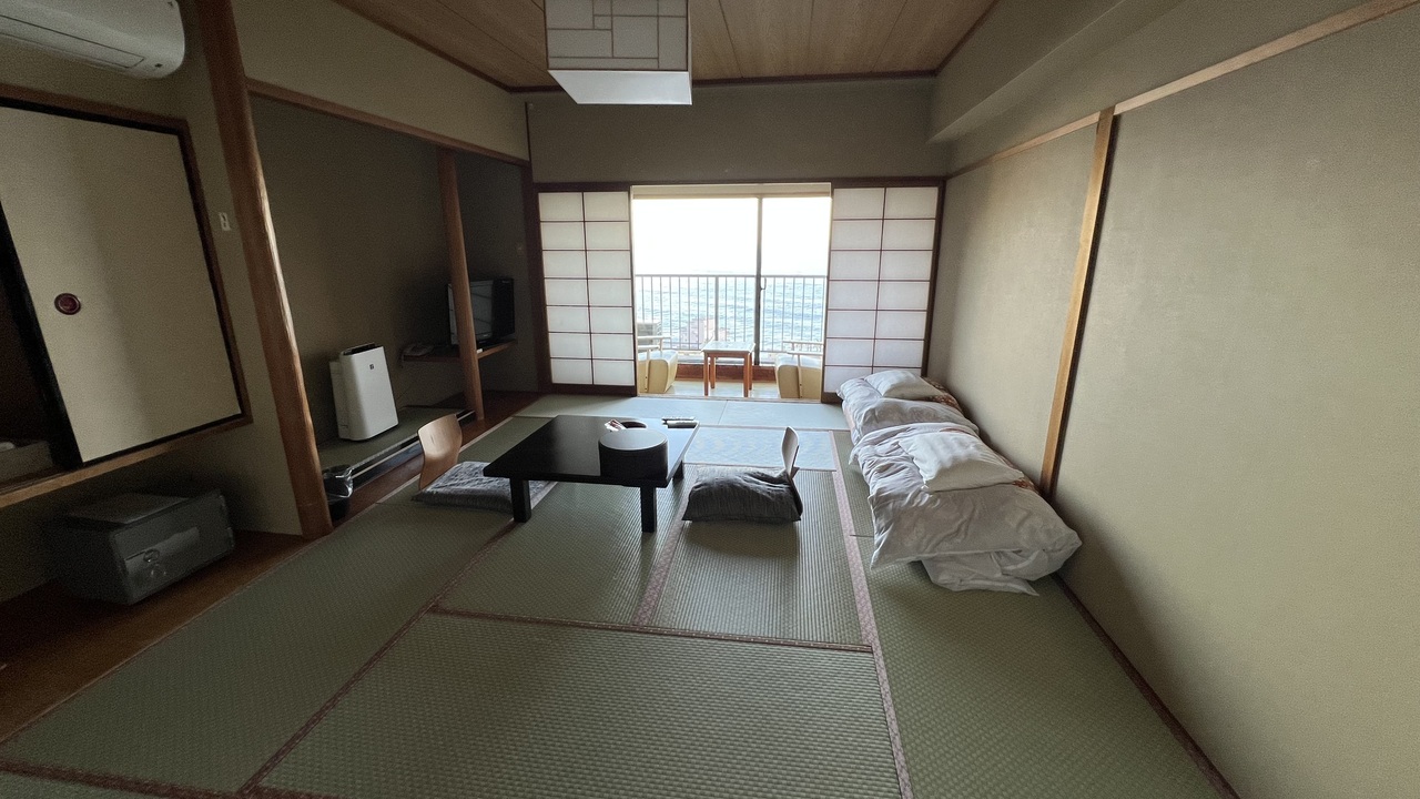 以前旅行サイトの口コミに酷評されていた記憶があり、少し覚悟して行きました。本館和室12畳の部屋でしたが、とても綺麗に整備されていて、良い意味で拍子抜けでした。とても使う気にならないと書かれていたバスルームも普通に綺麗でした。何より部屋からの眺望が最高です。ベランダがあり、湯煙上がる熱川温泉を見下ろし、大海原の先には伊豆大島が望めます。海から離れているから眺望もそれほどでもないのではと思っていましたが、大間違いでした。入れ替え制の浴室にはどちらにも露天風呂がありますが、一つはガラスの柵で、もう一つは木製の柵でした。木製だとせっかくの絶景が見られないので残念に思いました。温泉街に行くには坂を上り下りしないといけないので大変ですが、だからこその絶景が楽しめるのだと思いました。