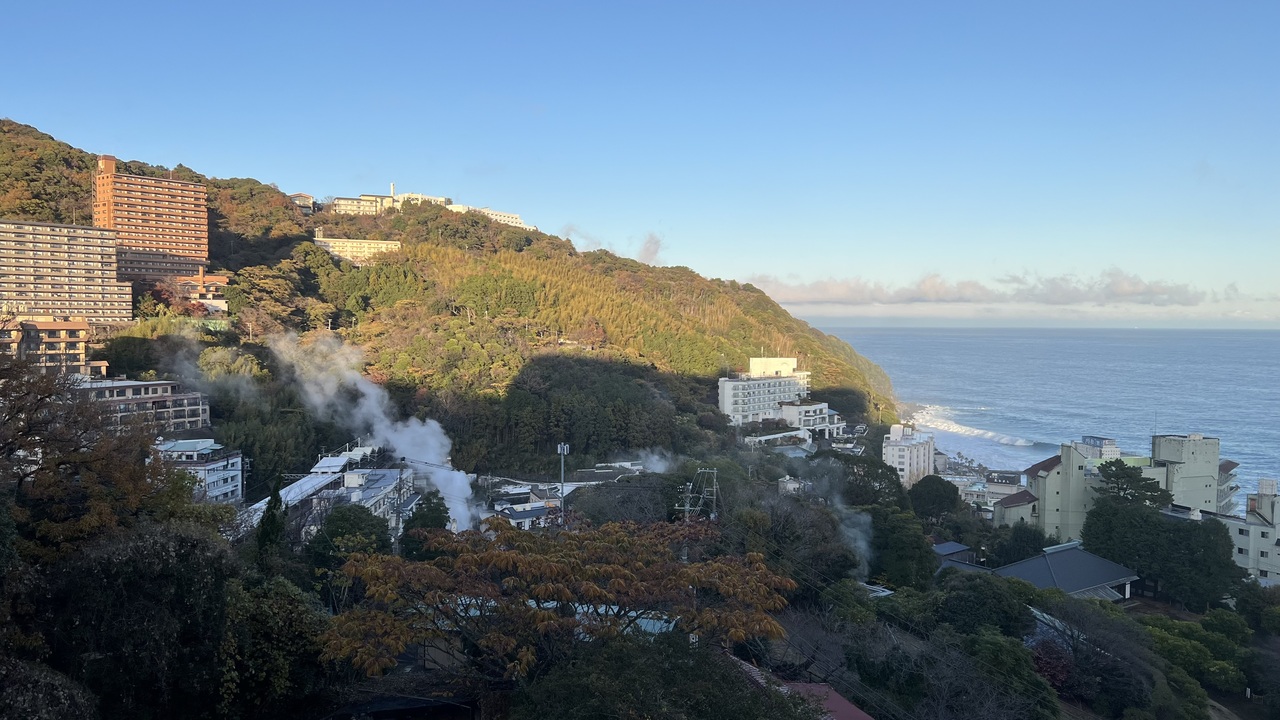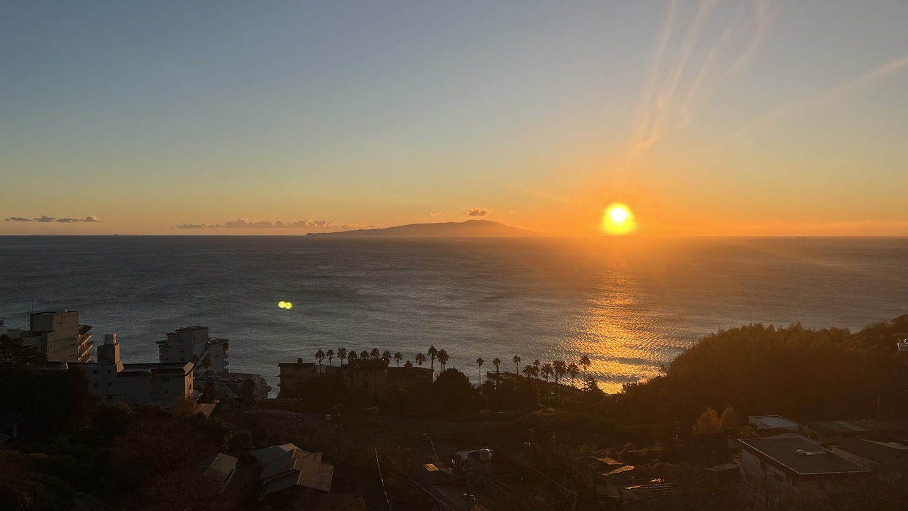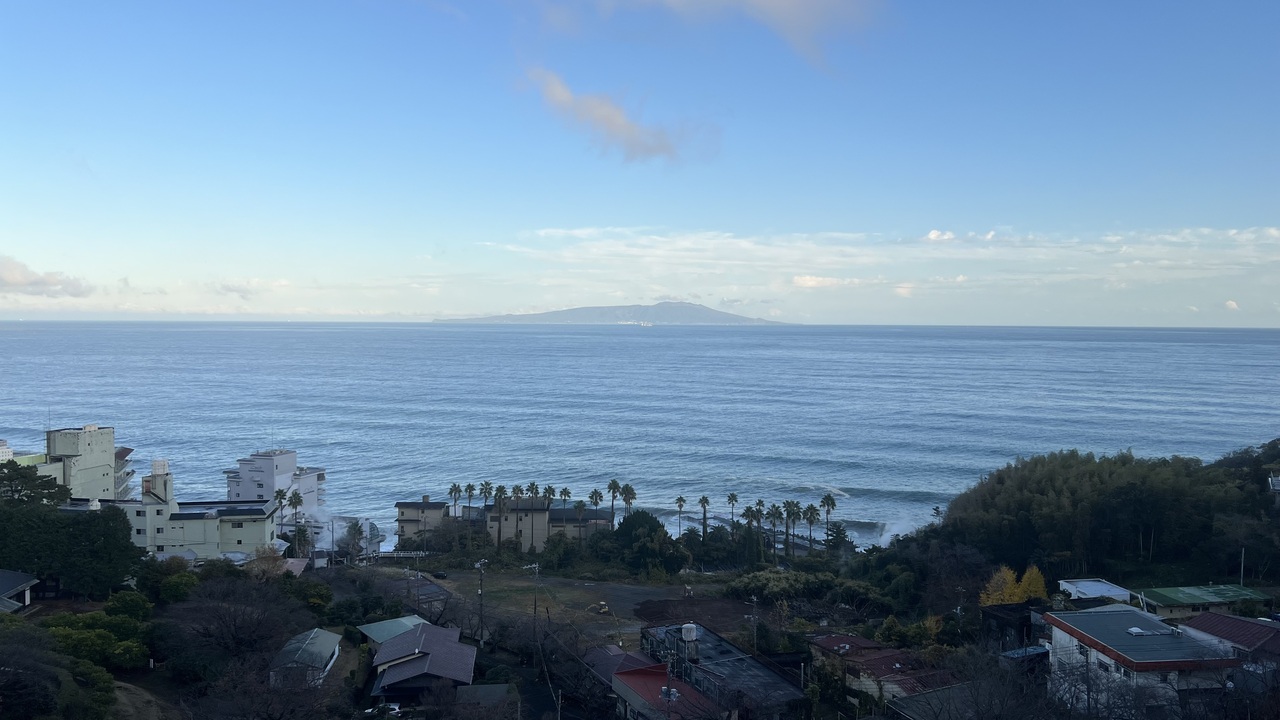 一覧を見る部屋からの眺望が最高です。熱川温泉を見渡せ、伊豆大島が真正面に見えます。