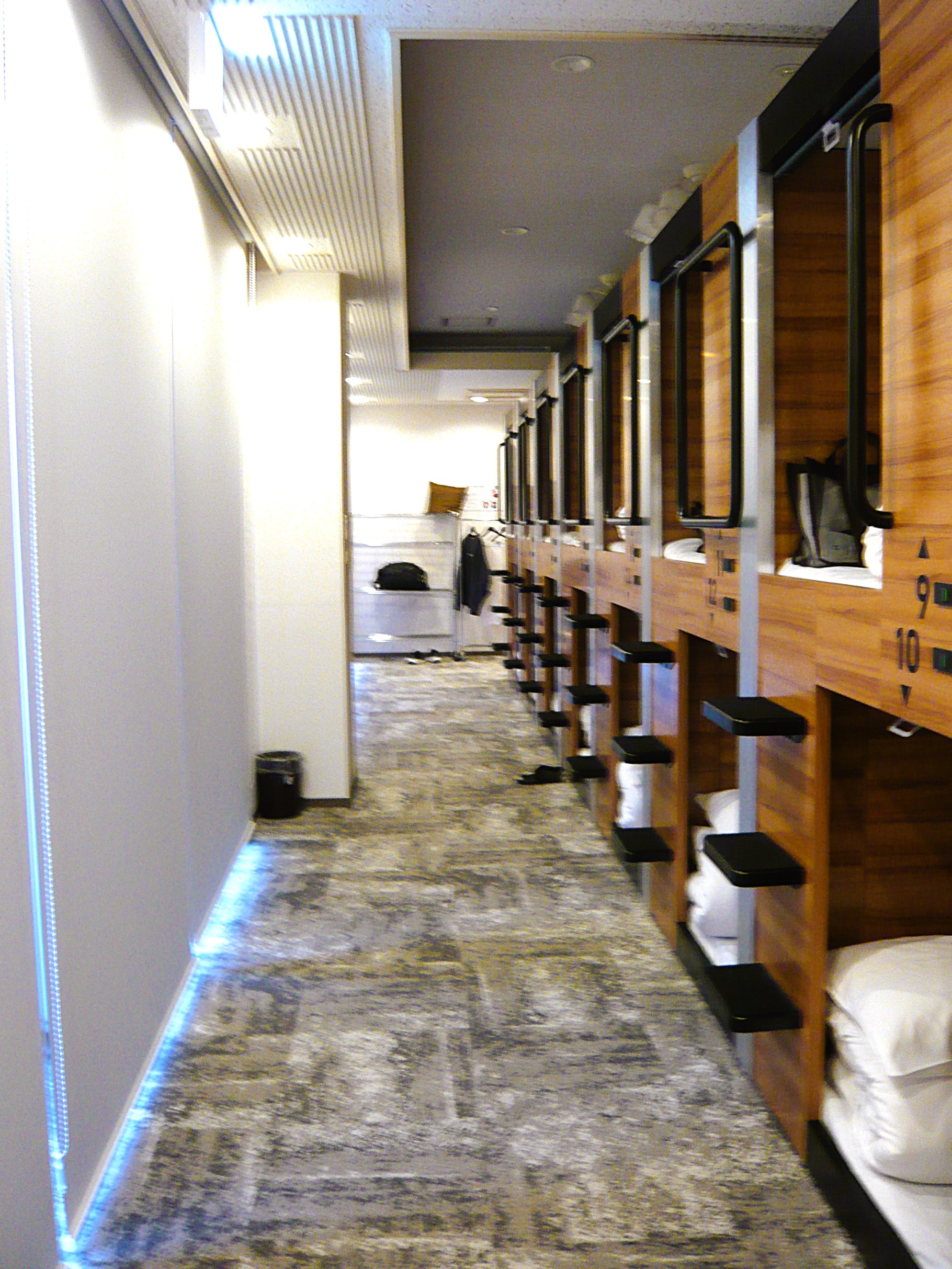 キャビンルームは1階・フロント横でカードキーでの管理です。一般的なカプセルタイプで鍵付きロッカーは小さくて全ては入りませんが、ハンガーラックが用意されてるのでジャケットやコート、使用タオルなどが掛けられて利便性が良いです。但し、脱いだ靴を入れるボックス・棚が無いので不安が残るかも知れません?…。
