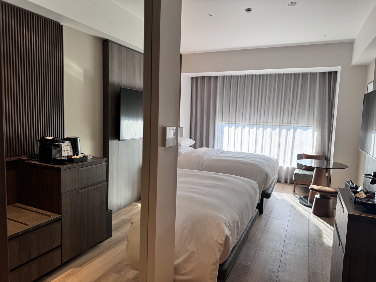 マリオット系列ならではのコーヒーメーカーがおいてあったり、ベッドも広いし、ペットボトルの水も毎日、新しいものを貰えました。