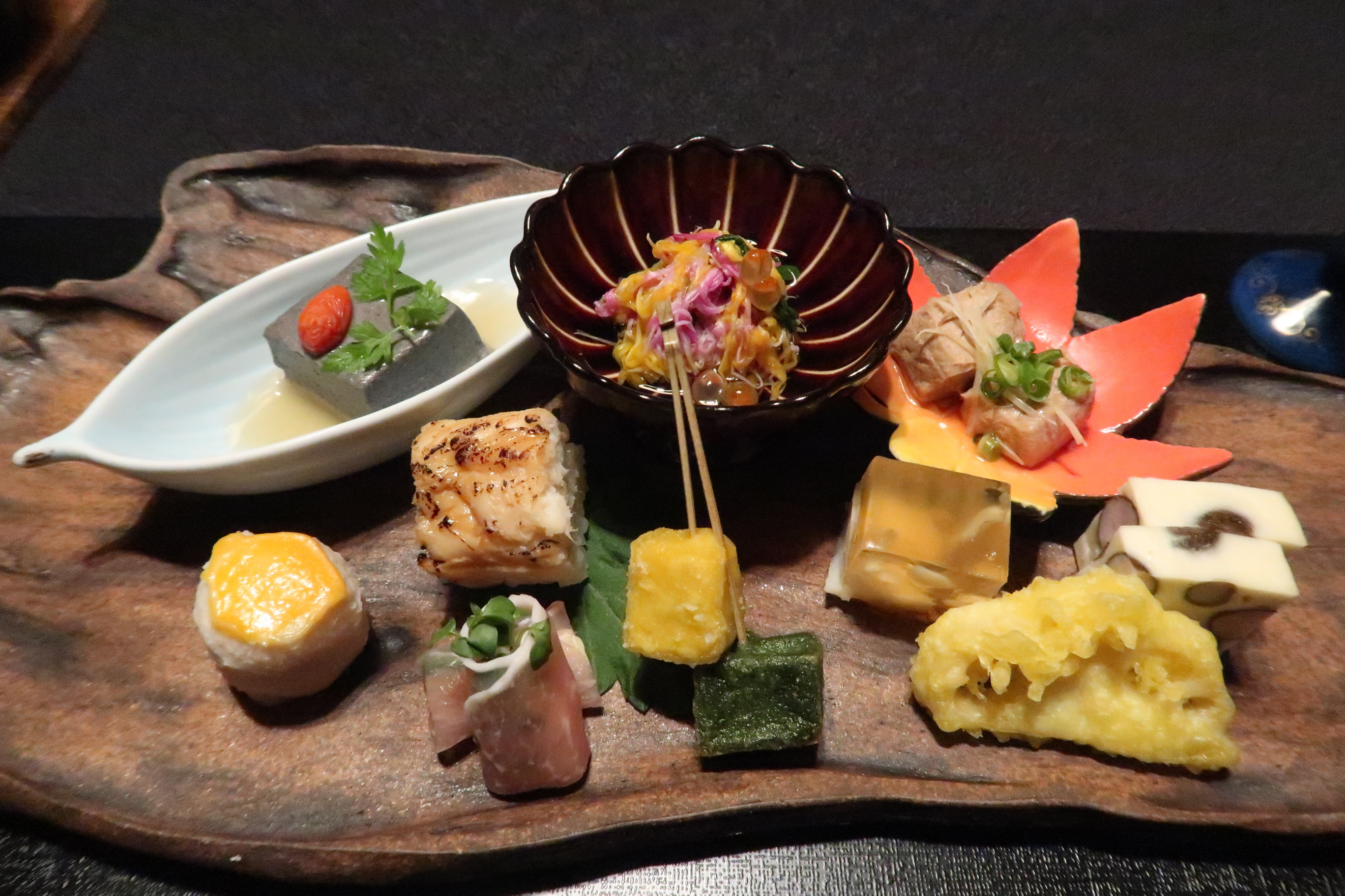 ●前菜 蓮根黄身揚げ/穴子棒寿司/鮪角煮/百合根煮凝りなど