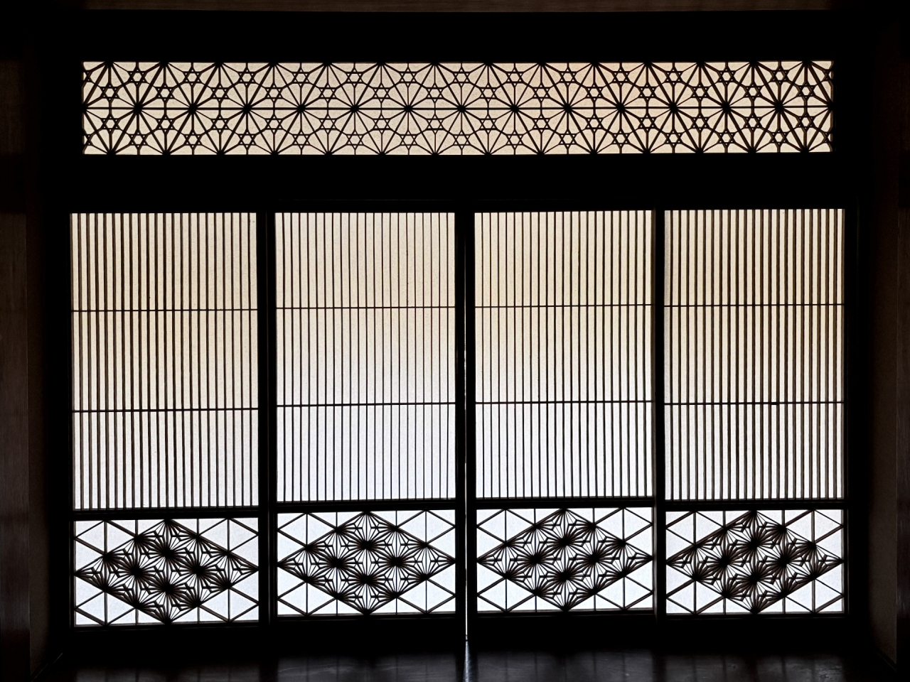 「早蕨」の寝室のステンドグラス。源氏物語に因む透かし彫りも。