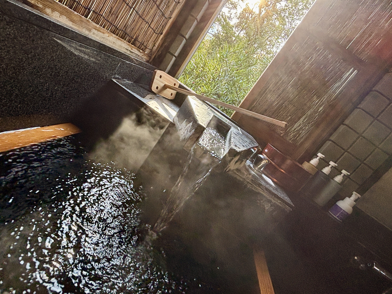 客室「早蕨」の100%源泉かけ流し・加水加温なしの内風呂。