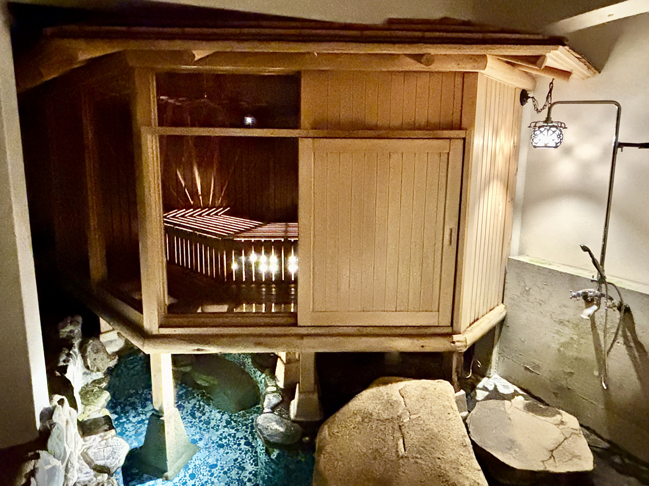 「月の湯」の「茶室サウナ」。川水を使った水風呂が流れる造り。