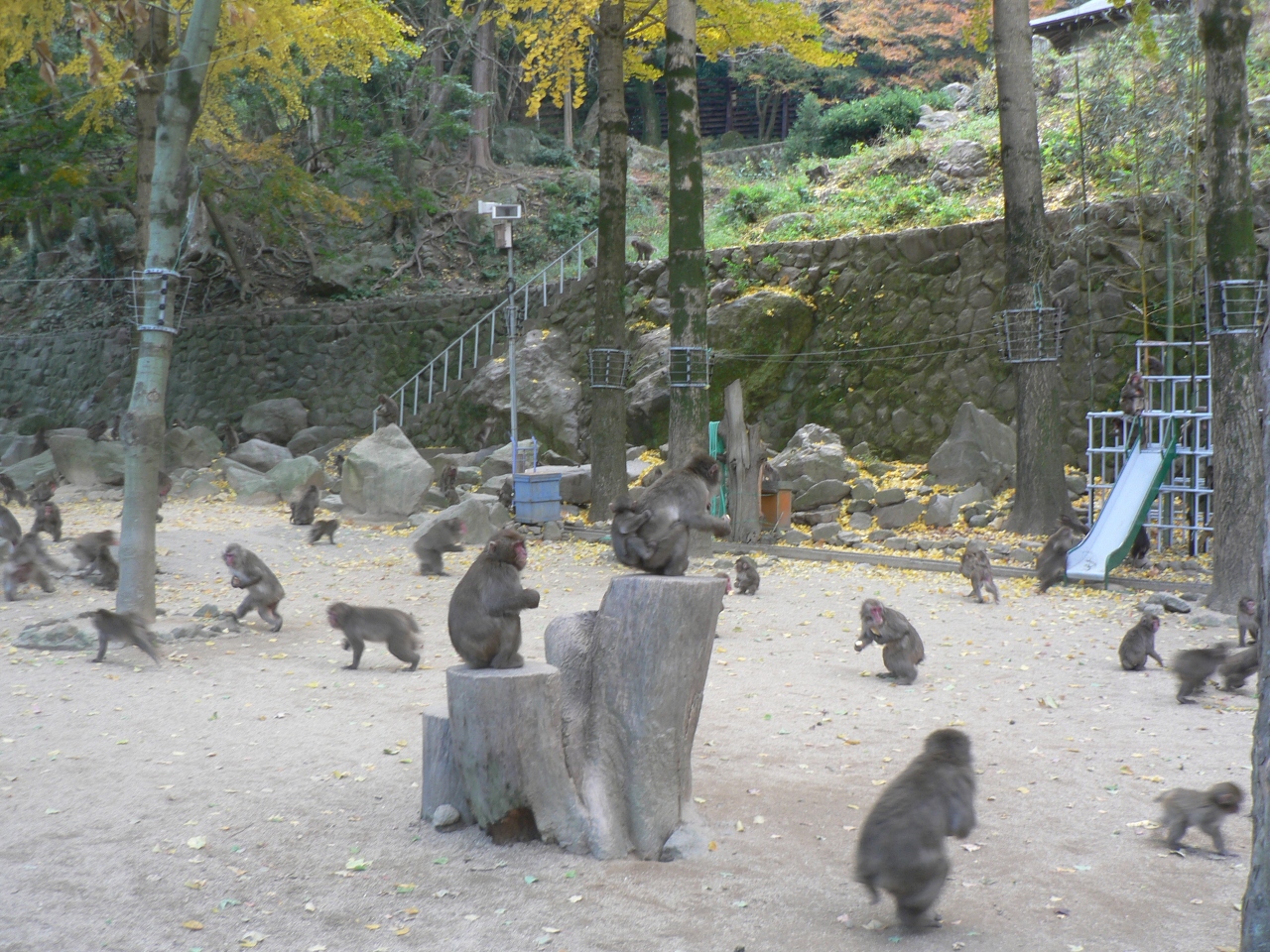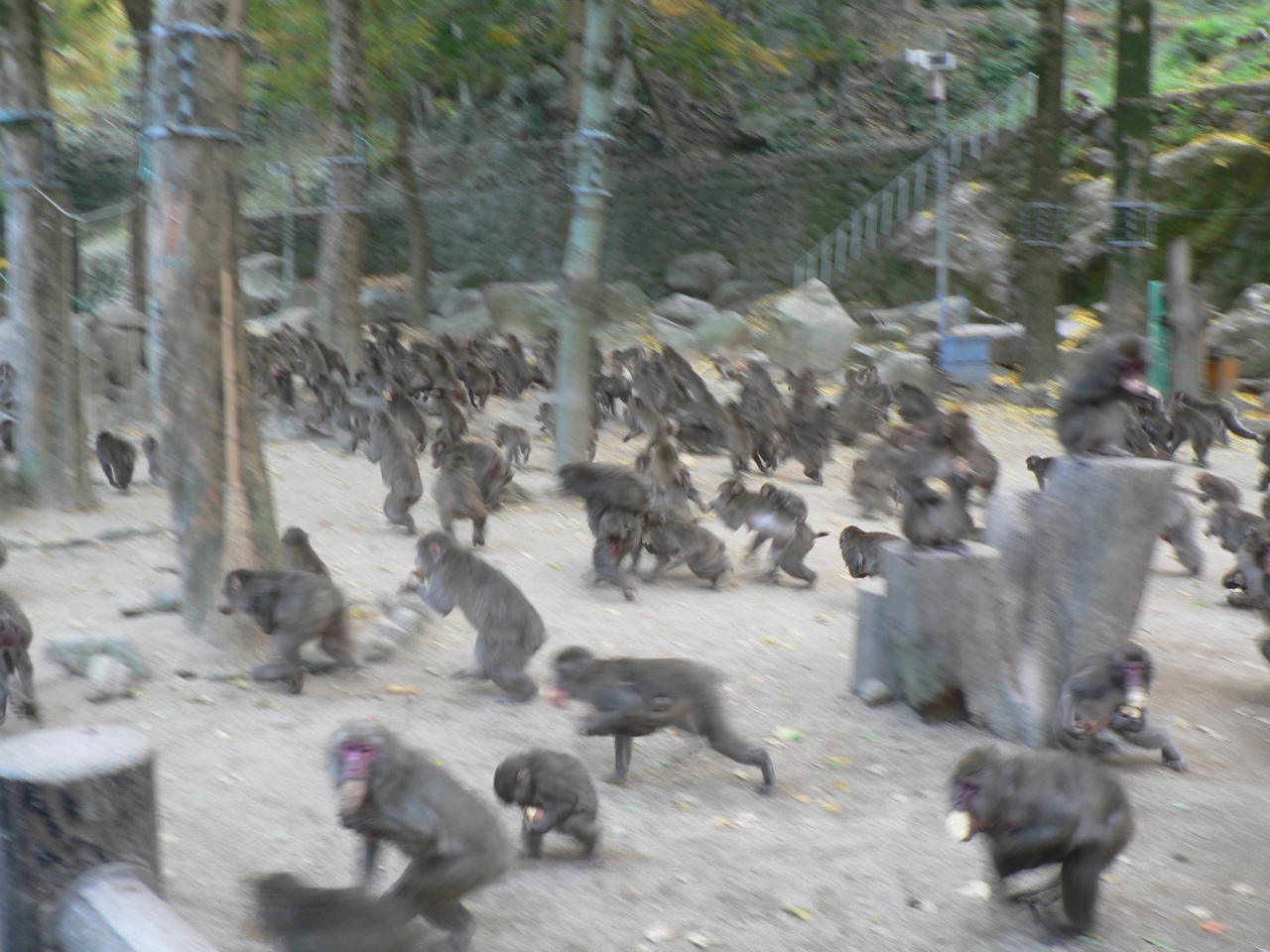 子猿がとても愛らしい。餌やりタイムの沢山のお猿さんには圧倒されます。