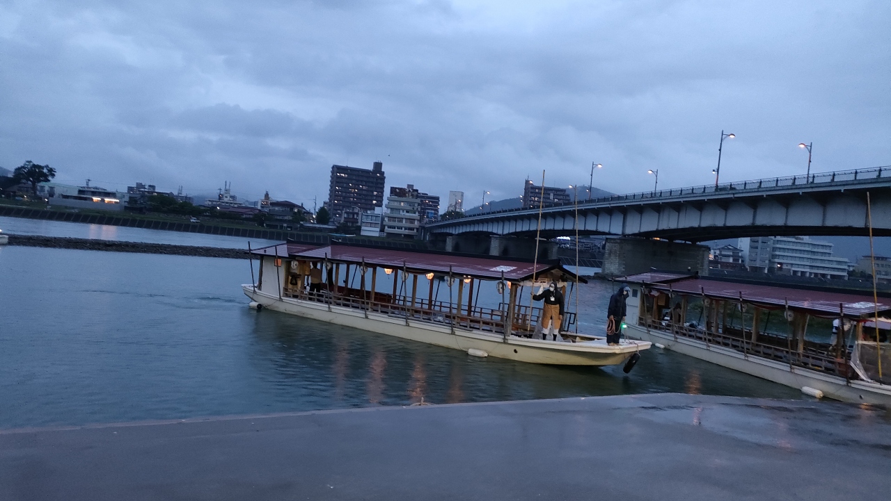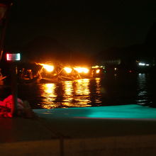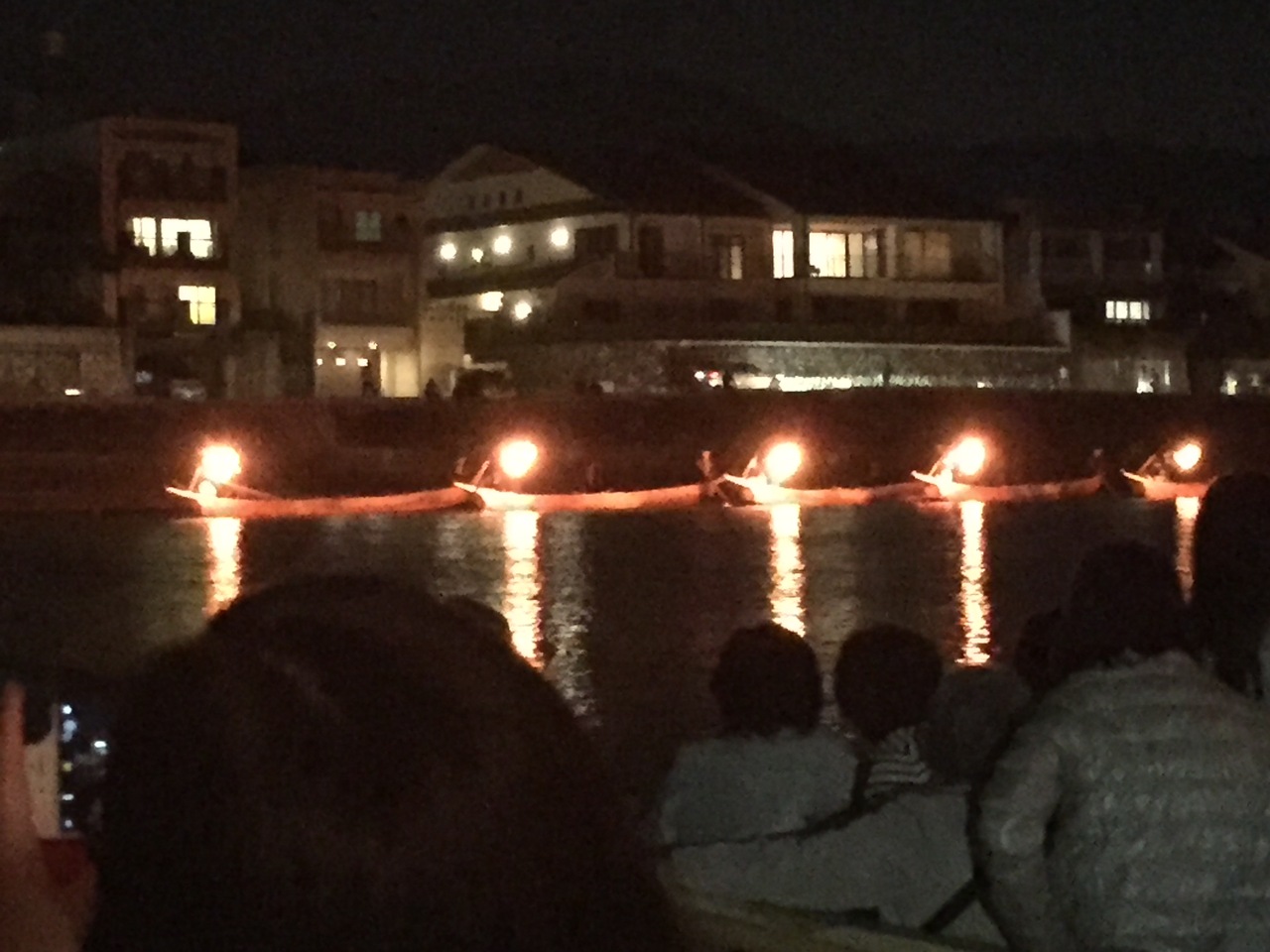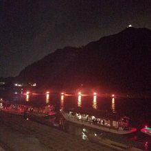 上流から漁火を炊いた鵜飼船が下りてきます。