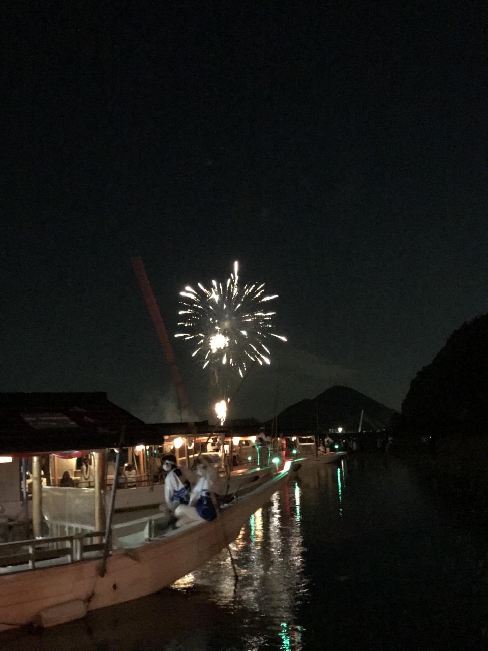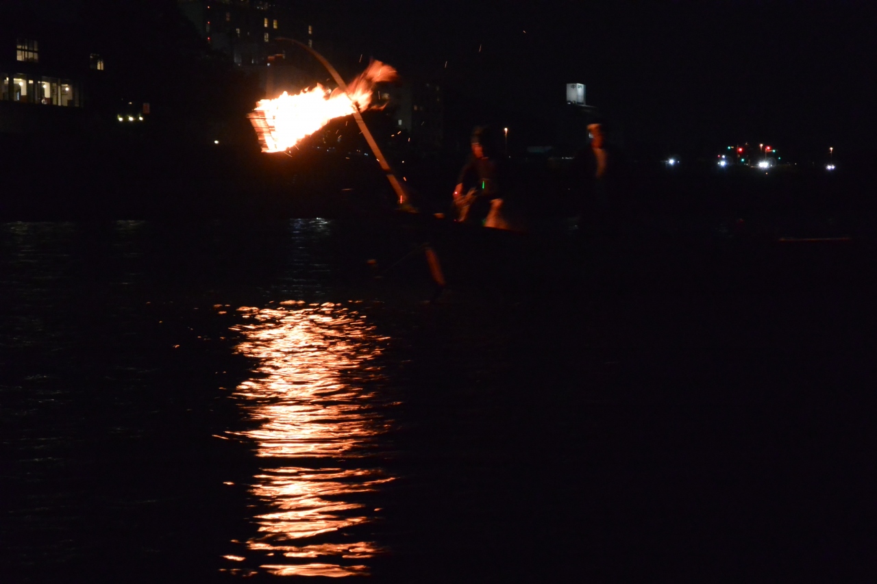 鵜飼開始には花火が上がり、松明が灯る中、鵜飼船がやってきます。