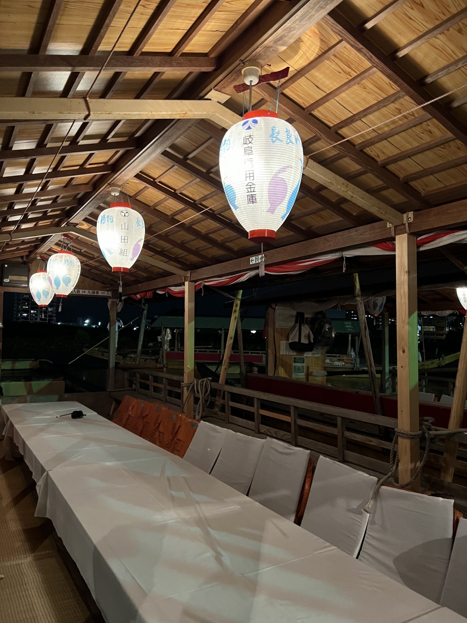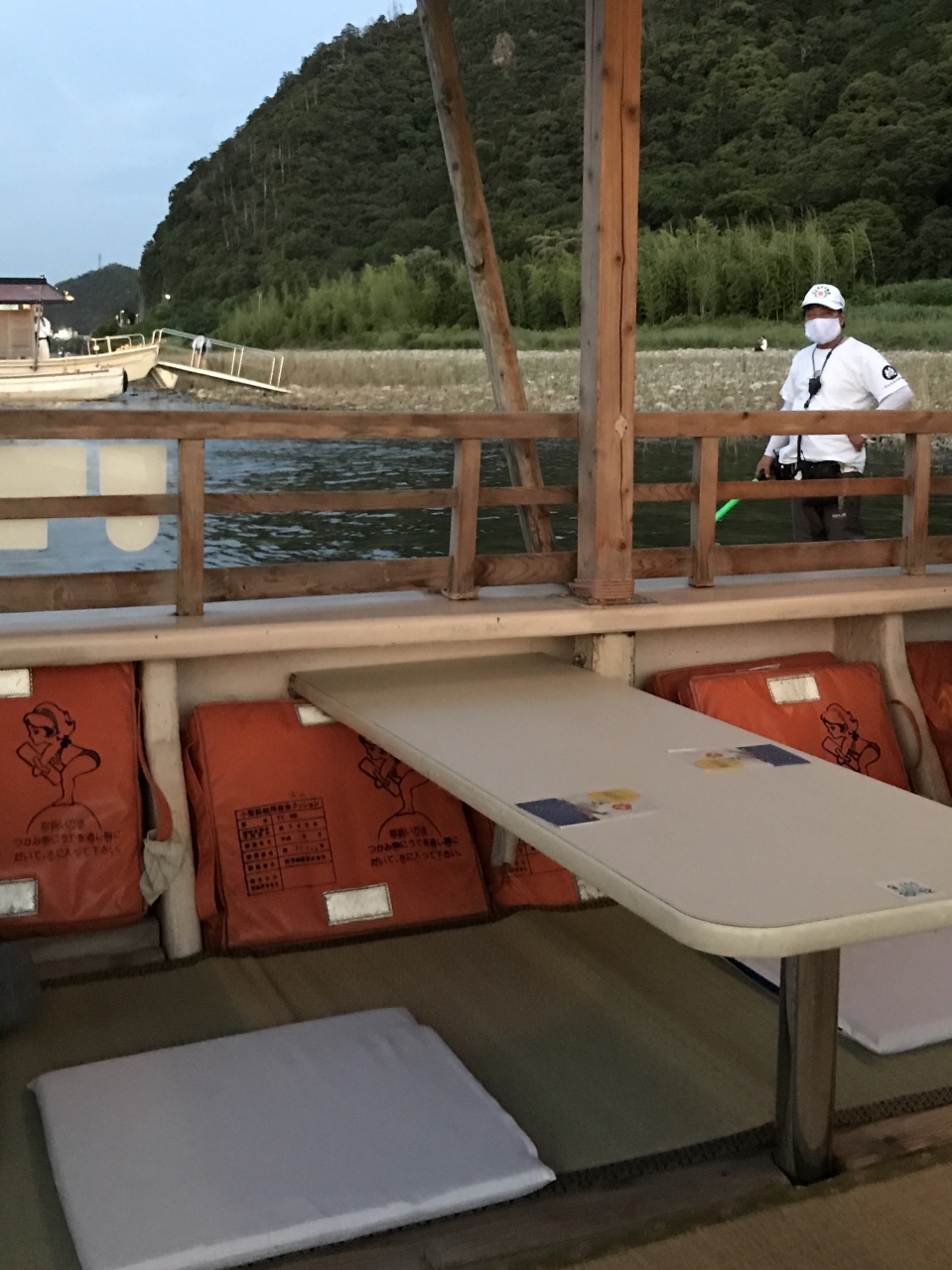 鵜匠による鵜飼の説明が終わり、いよいよ鵜飼観光船に乗り込みます。
