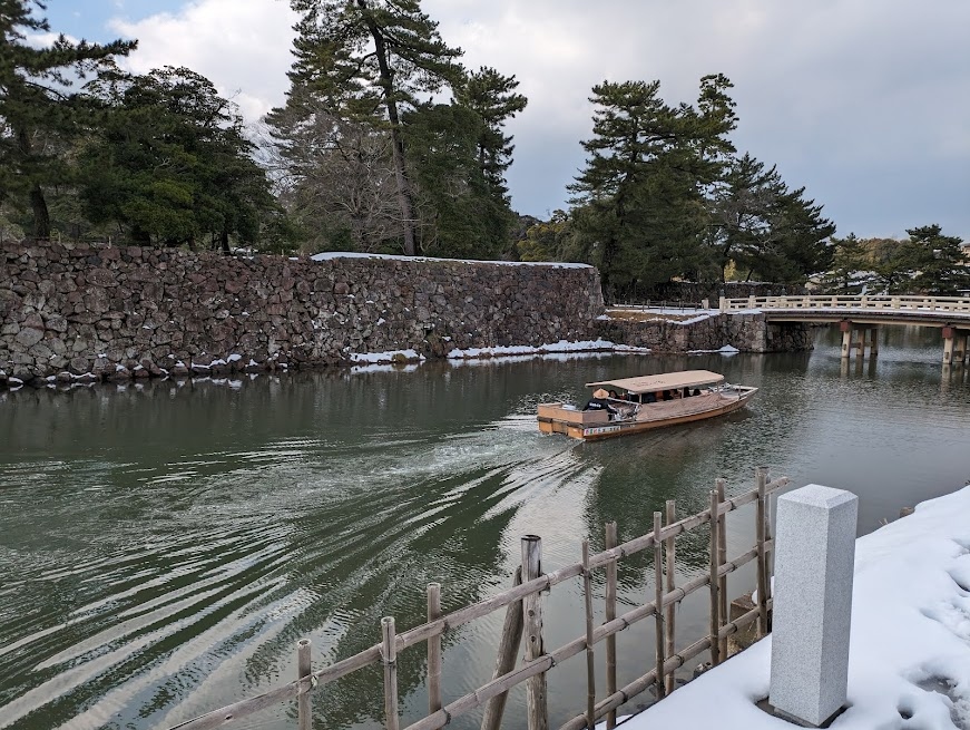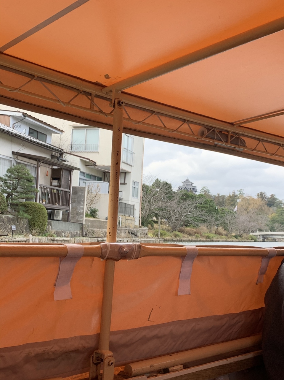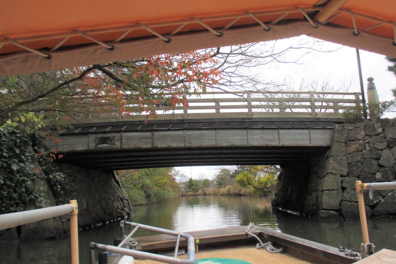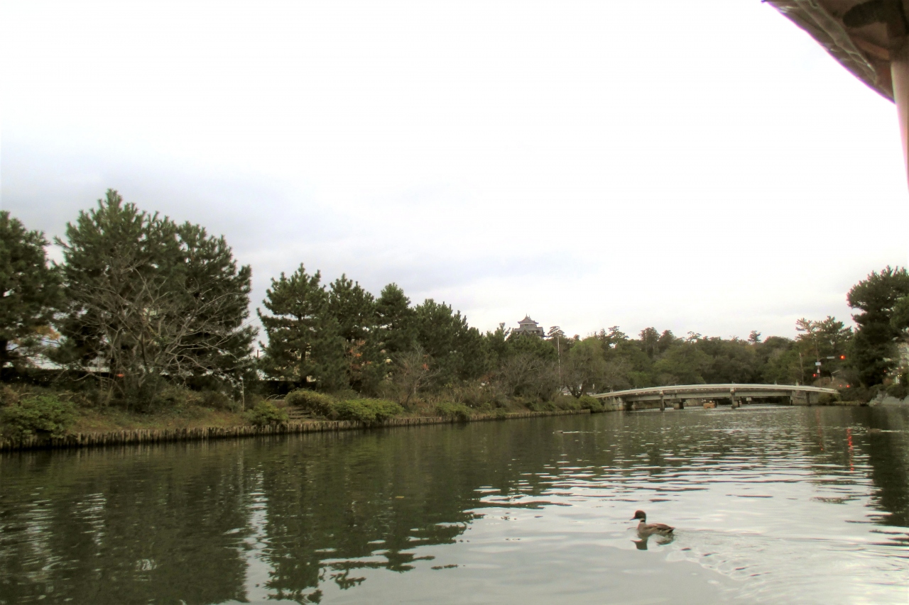 外堀に出ると低い橋がいくつかあり、屋根を電動で下げて通過します。その際、乗船客も頭を低くし協力する必要があります。大手前広場に戻る前には、松山城、北堀橋、外堀が見えるビューポイントがありました。