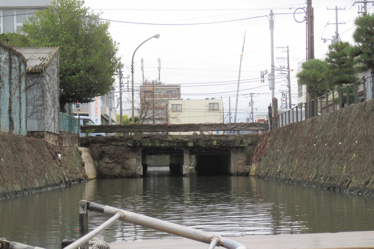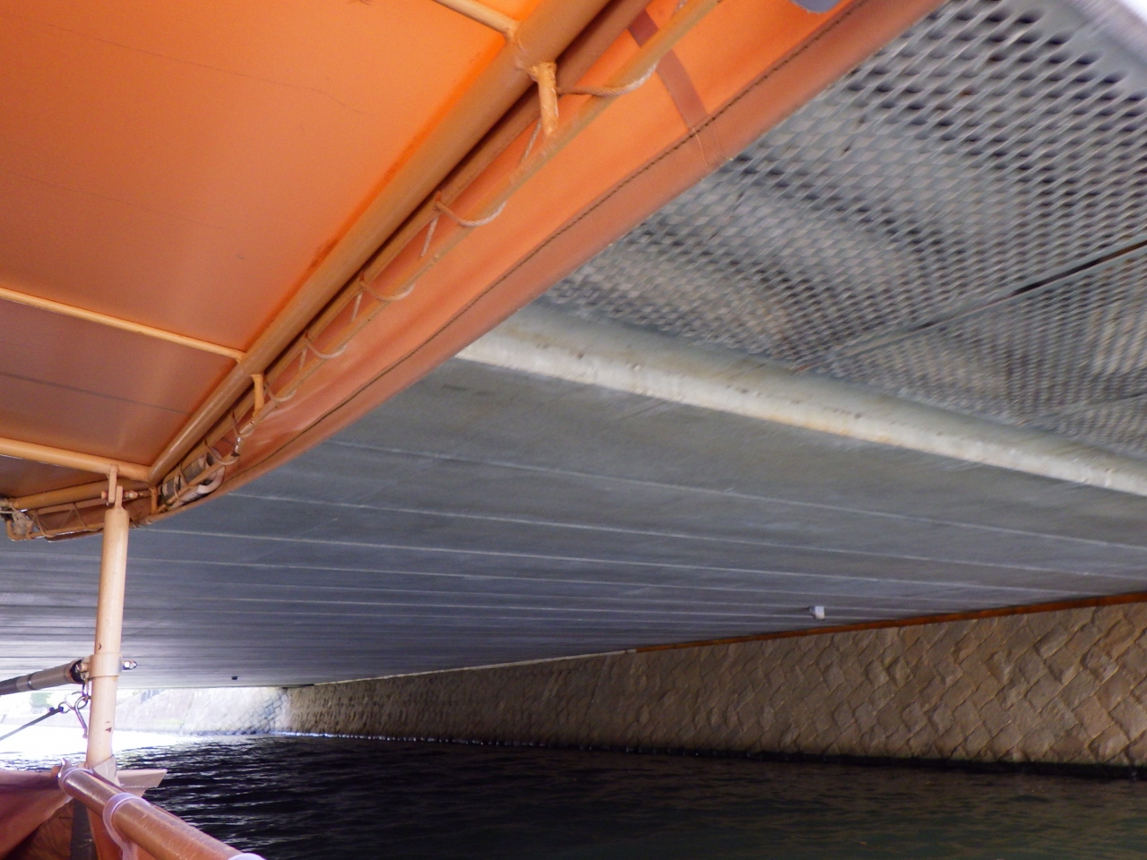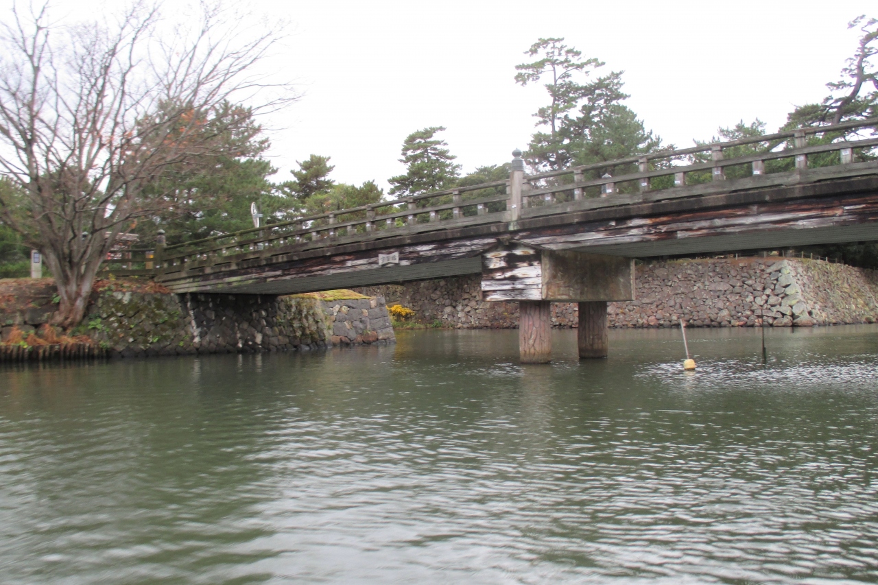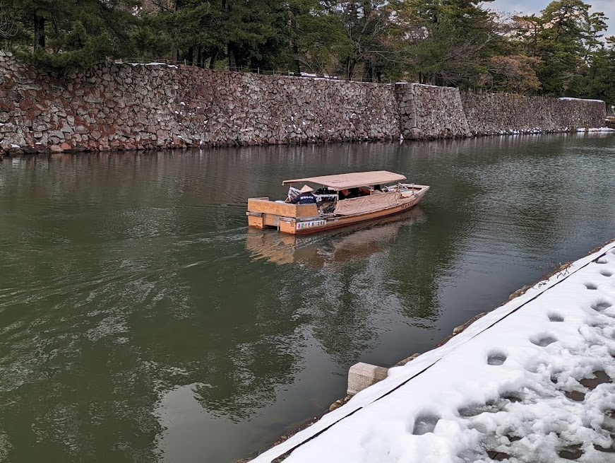 外堀に出ると低い橋がいくつかあり、屋根を電動で下げて通過します。その際、乗船客も頭を低くし協力する必要があります。大手前広場に戻る前には、松山城、北堀橋、外堀が見えるビューポイントがありました。