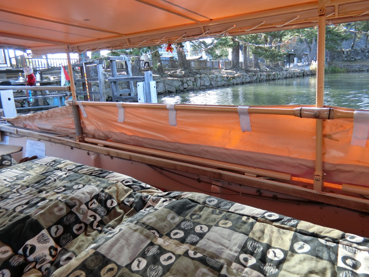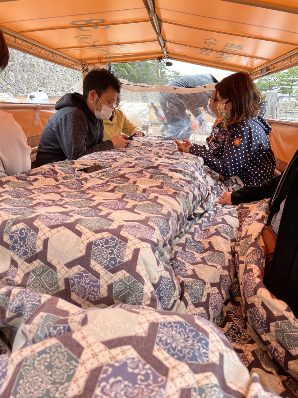 国宝松江城のお堀を約50分かけて周遊する遊覧船。乗船場所は松江堀川ふれあい広場、カラコロ広場、大手前広場の3ヵ所。冬季(11月~4月頃)は全ての船が「こたつ船」として運行され、こたつで暖まりながら、冬ならではの情緒ある景色を楽しむことができる。
