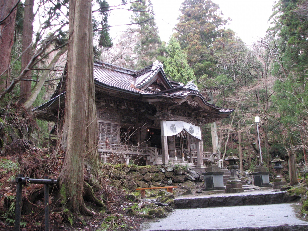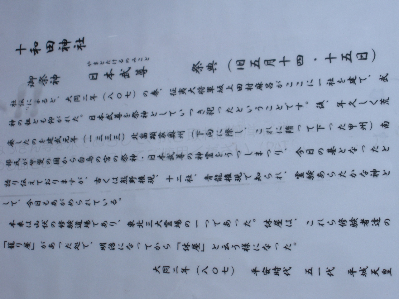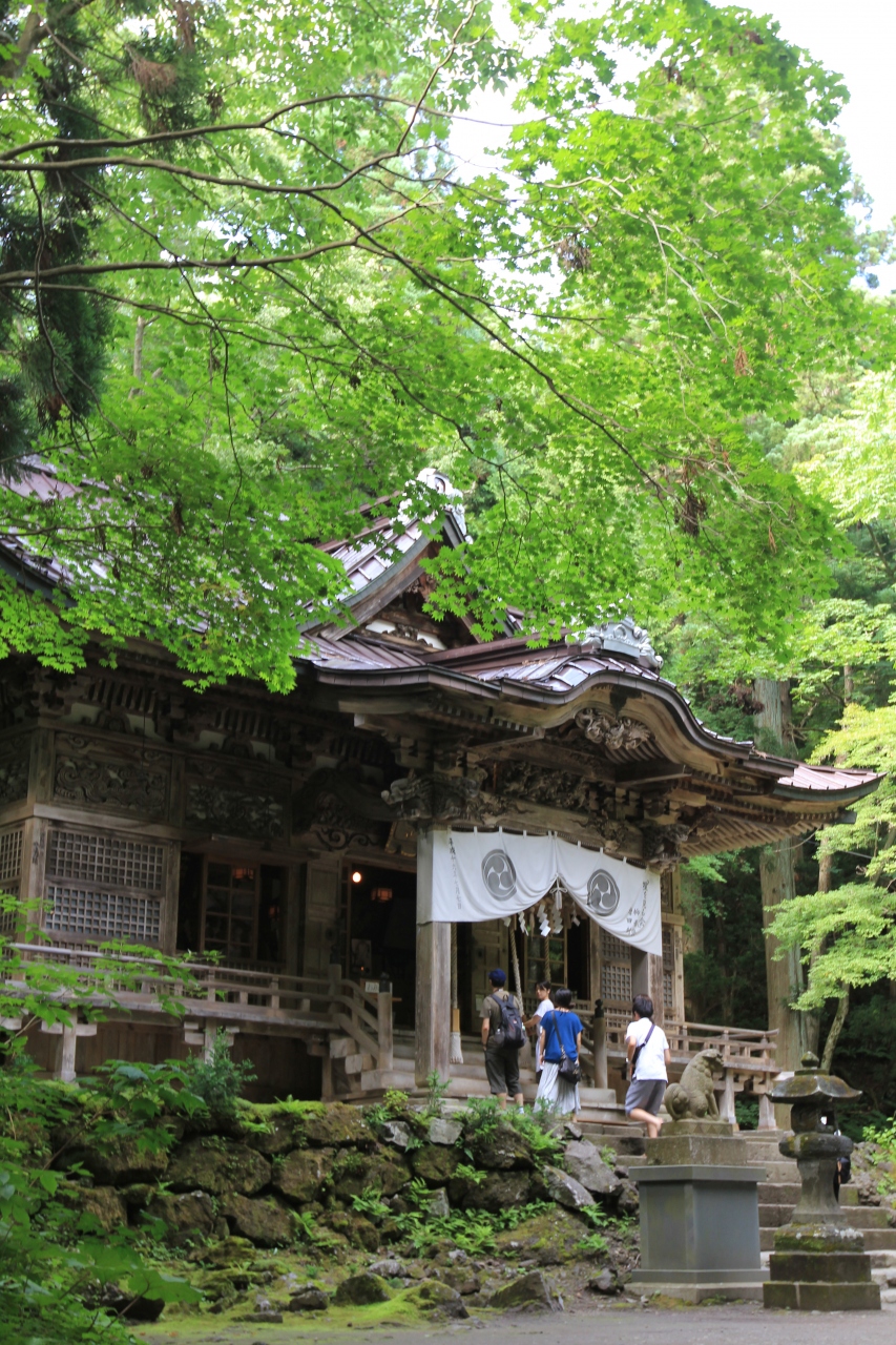 日本武尊(やまとたけるのみこと)と湖の主・南祖坊をまつったところ。鎌倉時代以前から修験僧徒(山伏)の修行場として知られ、江戸時代には南部藩の霊場として発展した。南祖坊の伝説にちなむ鉄のわらじが奉納されている。