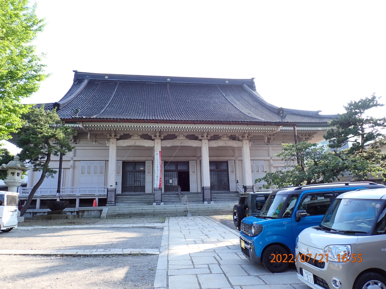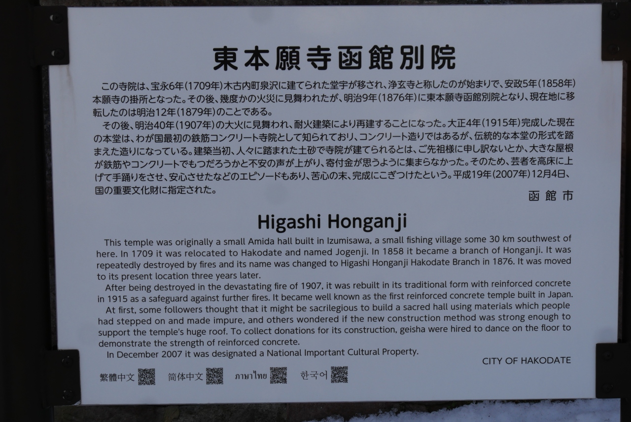 明治40年の大火で類焼、1915(大正4)年建替えに際して日本初の鉄筋コンクリート造りとした。ニ十間坂沿いに威風堂々と建つ。国指定重要文化財。東本願寺函館別院とも呼ばれる。