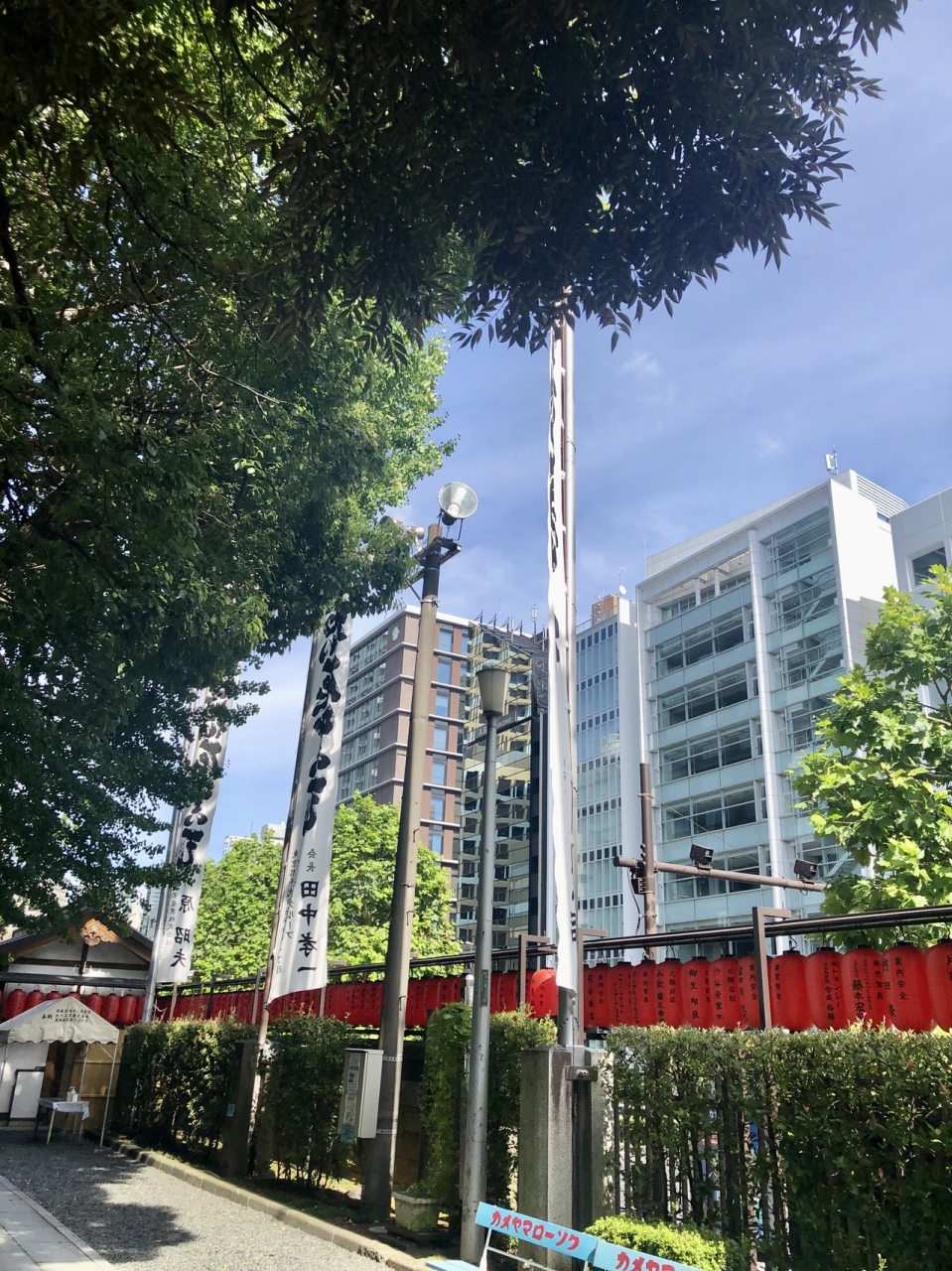 入り口の近くの芝生は、濃い緑色になっていて、幟等の色と対比され、鮮やかに感じさせられます。なにか躍動感さえ湧いてくるような感じの活気ある豊川稲荷東京別院の印象です。