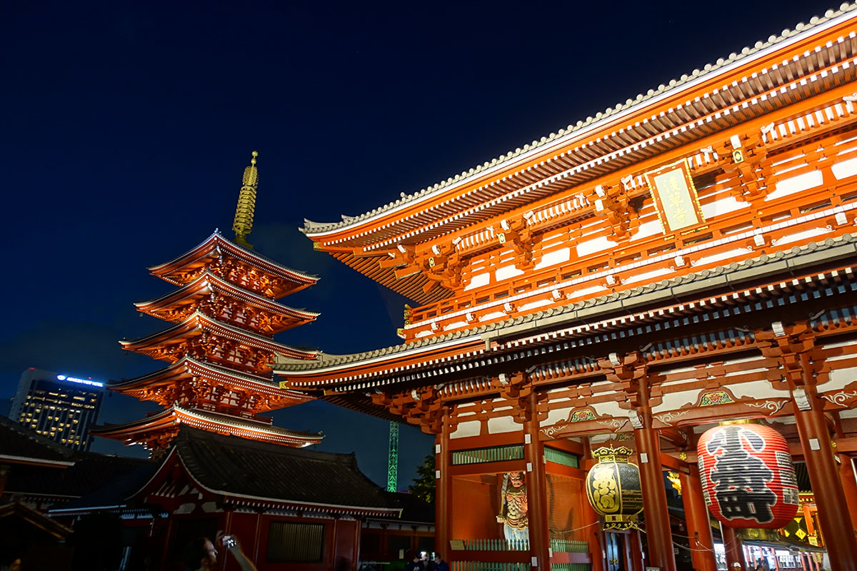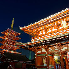 都内最古の寺で、本尊は聖観音菩薩です。元は天台宗に属していましたが第二次世界大戦後独立し、聖観音宗の総本山となりました。観音菩薩を本尊とすることから「浅草観音」や「浅草の観音様」の呼び名で、あらゆる階層から広く親しまれ、年間約三千万人もの参詣者が訪れて民衆信仰の中心地となっています。雷門の大提灯、仲見世が江戸情緒を伝えています。浅草名所七福神(大黒天)