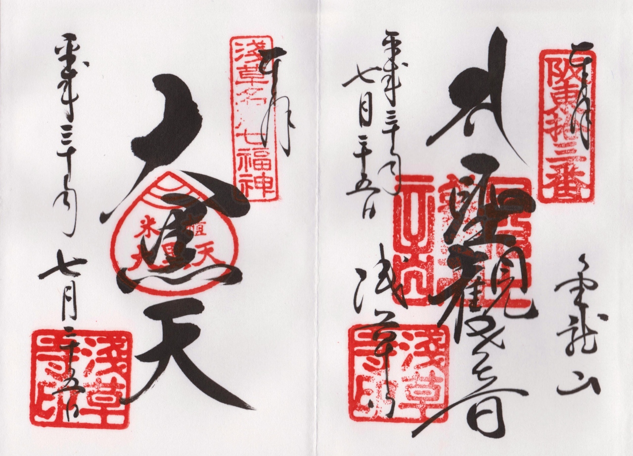 都内最古の寺で、本尊は聖観音菩薩です。元は天台宗に属していましたが第二次世界大戦後独立し、聖観音宗の総本山となりました。観音菩薩を本尊とすることから「浅草観音」や「浅草の観音様」の呼び名で、あらゆる階層から広く親しまれ、年間約三千万人もの参詣者が訪れて民衆信仰の中心地となっています。雷門の大提灯、仲見世が江戸情緒を伝えています。浅草名所七福神(大黒天)