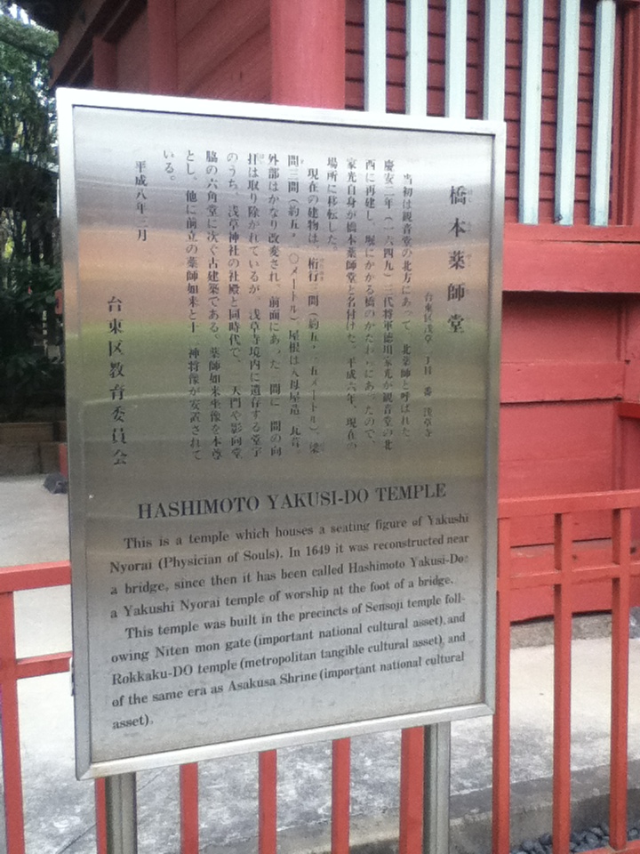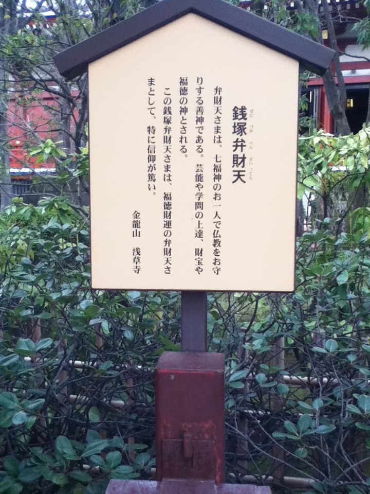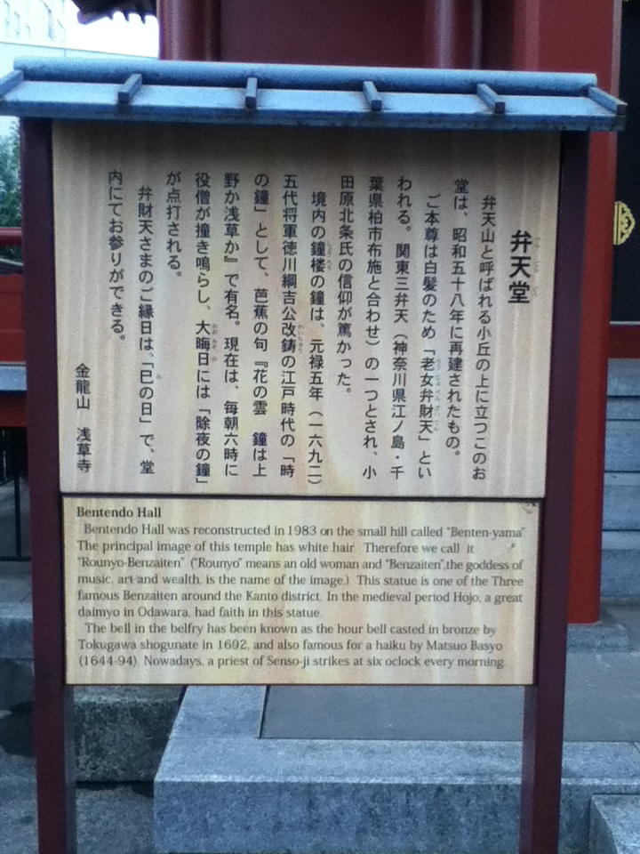 弁天堂は浅草寺本堂の南東にある。数人が参拝していた。お勧めの点は、一般に弁天堂で祀られている弁財天は七福神のなかの唯一の女... 続きを読む神であり、この弁天堂のご本尊は白髪であることから、老女弁天と呼ばれ全国でもめずらしい弁財天となっており、弁財天は財福や商売繁昌のご利益がありまたこの弁財堂は関東三弁天の一つであることから、金運や商売繁栄を祈願したい人にとっては訪問する価値があること、またこの弁財堂の建物は1983年に再建されたもので、屋根は入母屋造り、本瓦葺きで、壁の一部八柱は鮮やかな朱色で素敵な建物であり、特に寺院建築に関心のある人にとっては訪問価値があることである。