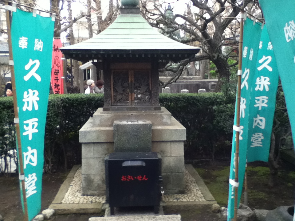 久米平内堂は浅草寺本堂の右側、宝蔵門の近くにある。水色系の幟が並び目立つ。数人がお参りしていた。お勧めの点は、久米平内は江... 続きを読む戸時代前期の武士、首切り役人で多くの人を殺したが、その罪から逃れるために自分の石像を仁王門の近くに埋めて浅草寺の参拝者に踏んでもらったとも言われていること、その石を踏みつけて「文をつけたことにする」と意味が転じ願文を納めると願いが叶うとされていたこと、この石が久米平内堂に納められていること、お堂は江戸時代に建てられたが、1945年の空襲で焼けてしまいその後、再建されたこと、お堂は屋根が銅葺ほこらの木の扉には彫刻が彫られていて古いながらも美しいものであること、上記の久米平内の石が納められていることから江戸時代中期以降、縁結びの神として多くの人から信仰されてきており、また建築物としても美しいことから特に良縁を祈願する人や寺院検地に関心のある人にとっては訪問する価値があることである。 閉じる