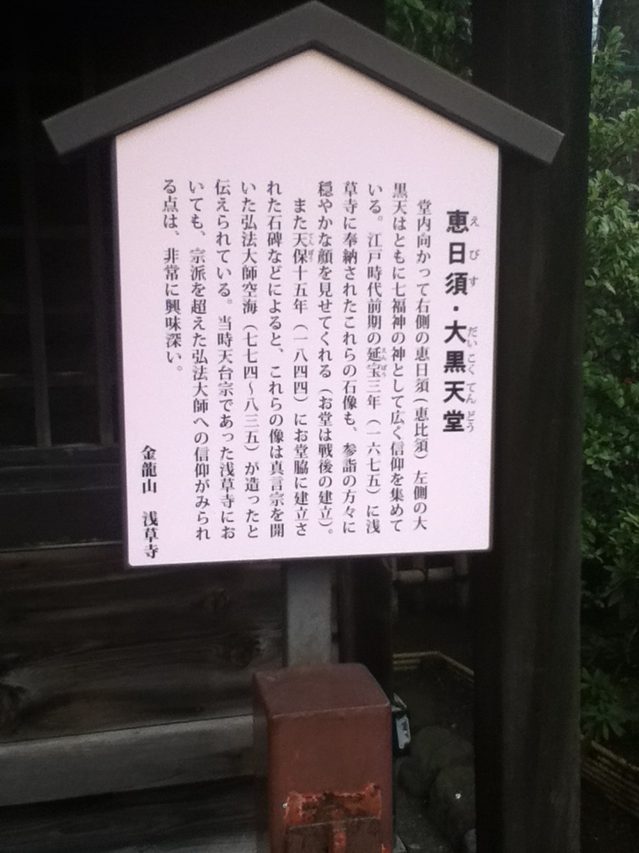 恵比須・大黒天堂は、浅草寺境内の影向堂の近くにある。数人がお参りしていた。お勧めの点は、恵比須・大黒天堂は瓦屋根の木造の小... 続きを読むさい建物で戦後に建立されたこと、堂の中には右に恵比須、左に大黒の石像が鎮座していること、これらの石像は真言宗開祖の弘法大師空海が作ったと言われ、丁寧に作られ美しいものであること、恵比須は商売繁盛、除災招福、五穀豊穣、大黒天は五穀豊穣・子孫愛育・出世開運のご利益がそれぞれあると言われ、また二つの石像が一つのお堂に納められているのは珍しく特にこれらのご利益を願いお参りしたい人や七福神の石像に関心のある人にとっては訪問する価値がある価値があることである。 閉じる