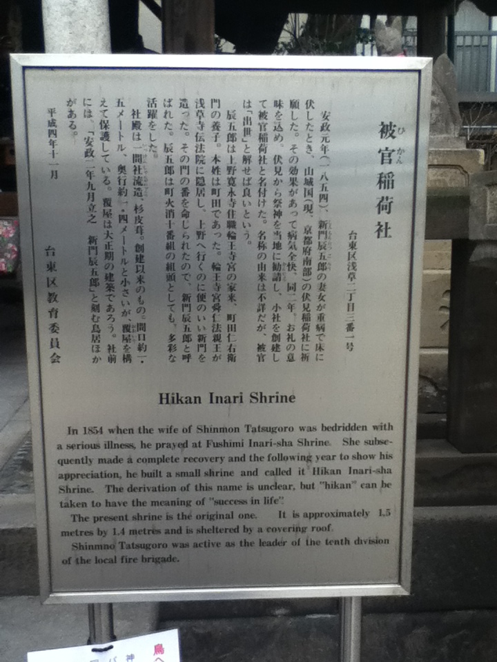 被官稲荷神社は浅草神社の近くにある。最初の鳥居をくぐり入っていくと、さらに鳥居が3つありその先に小さな社殿がある。数人がお... 続きを読む参りしていた。お勧めの点は、安政元年(1854)新門辰五郎の妻が重病になり伏見稲荷に祈願して平癒したことから、町の人々が感謝の意も含めて伏見稲荷から御分霊を勧請し創建されたこと、被官稲荷神社は浅草神社の末社で、「官を被る」すなわち官位を授かるという意味から、就職・出世などの祈願すれば願い事が叶うかもしれないこと、社殿は大変古いものの丁寧に作られていて今でも残っていること、このように就職・出世のご利益があり大変古い社殿があることから特に就職や出世を祈願したい人や寺院建築に関心のある人にとっては訪問する価値があることである。 閉じる