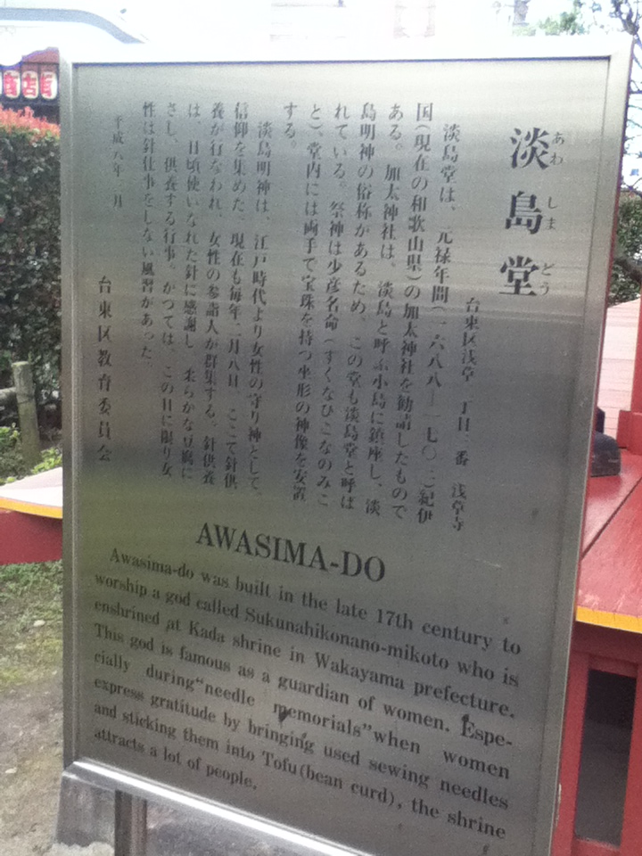浅草寺本堂の西側にある。本堂周辺に比べ、観光客はかなり少なかった。お勧めの点は、淡島堂は元禄年間(1688~1704)、紀... 続きを読む伊国加太の淡島明神を勧請して建てられたこと、本尊の阿弥陀如来像、淡島明神像と本地仏の虚空蔵菩薩像、取子地蔵尊などが安置されていること、淡島明神は女性の守り神として昔から多くの人々の信仰を集めていること、毎年2月8日の針供養会が開催されていること、淡島堂は柱や壁などが小豆色の立派な建物であることから、特に安全等の祈願したい女性や寺院建築に関心のある人、針を使っている縫製等をしている人々にとっては訪問する価値があることである。 閉じる