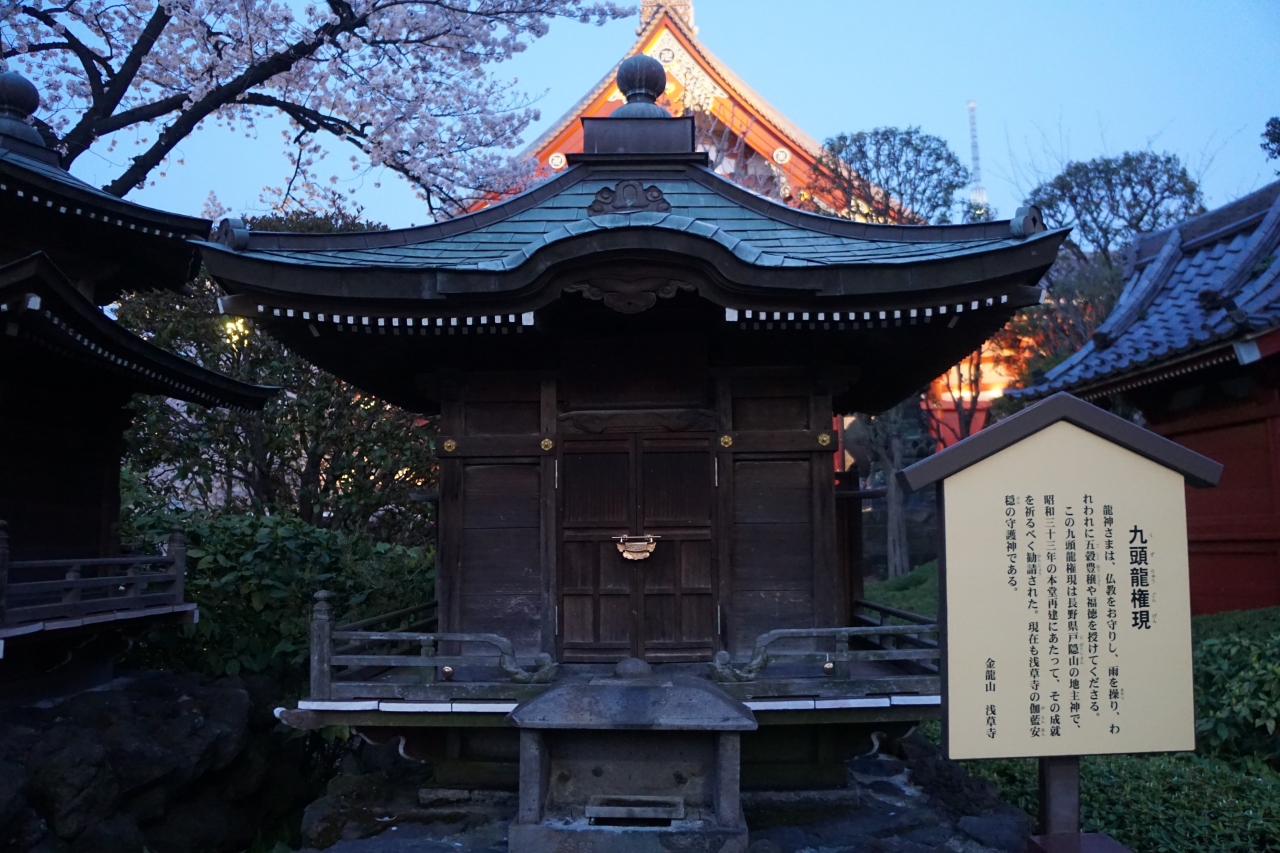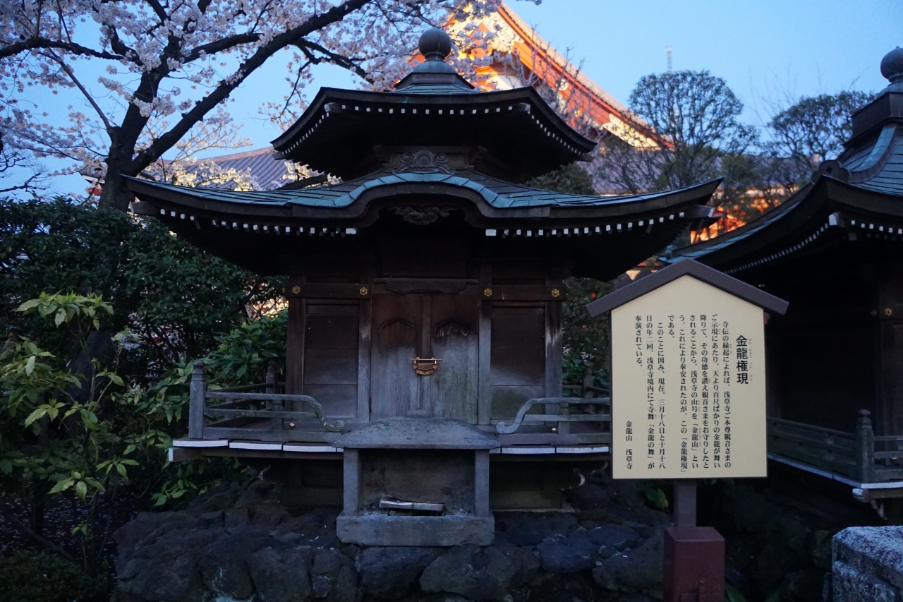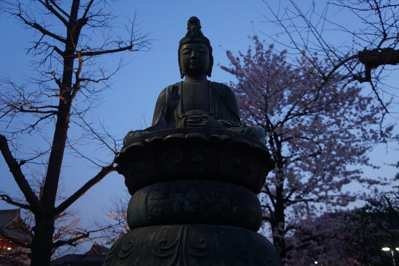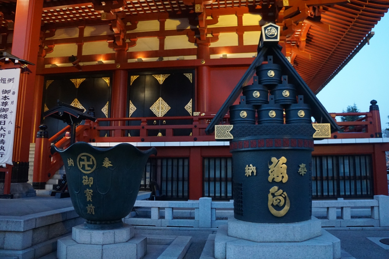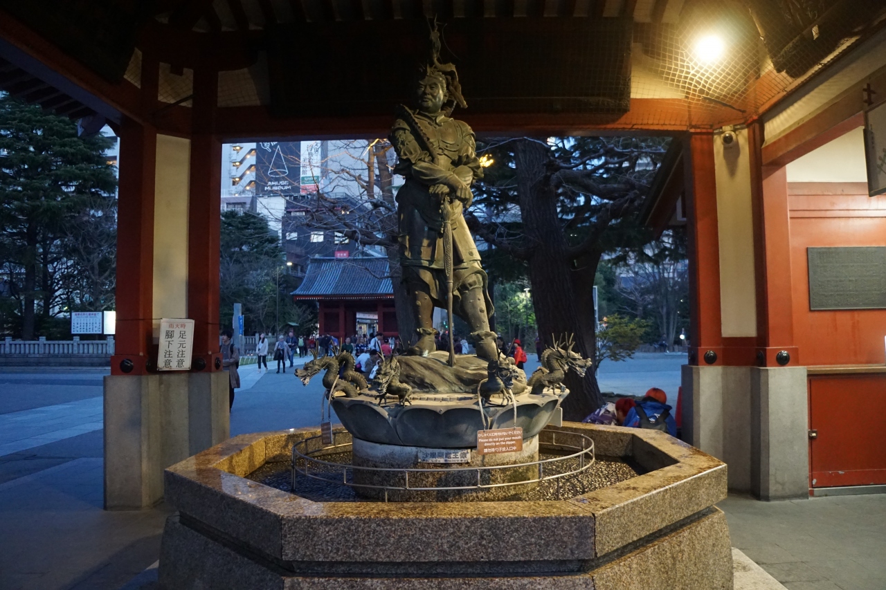 都内最古の寺で、本尊は聖観音菩薩です。元は天台宗に属していましたが第二次世界大戦後独立し、聖観音宗の総本山となりました。観音菩薩を本尊とすることから「浅草観音」や「浅草の観音様」の呼び名で、あらゆる階層から広く親しまれ、年間約三千万人もの参詣者が訪れて民衆信仰の中心地となっています。雷門の大提灯、仲見世が江戸情緒を伝えています。浅草名所七福神(大黒天)