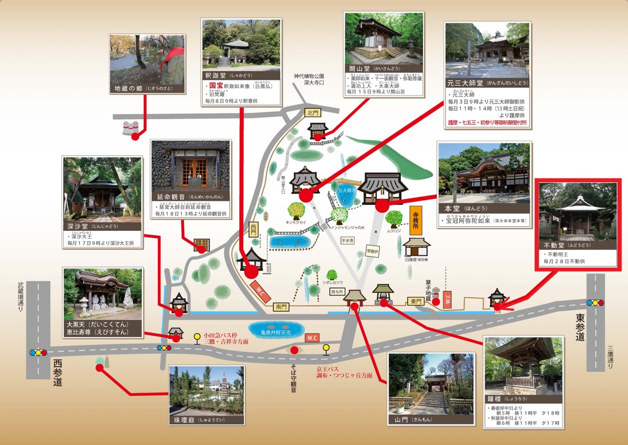 豊かな緑と湧き水に恵まれ、武蔵野の風情を色濃く残す一角に立つ深大寺は、天台宗別格本山の寺院で、都内では浅草寺に次ぐ古刹です。その起源は奈良時代、満功上人によって創建されたといわれ、大化の改新のころ近くに製作されたと推定される白鳳仏(釈迦如来倚像、国宝)、梵鐘(国の重要文化財)などの貴重な寺宝で知られています。 この地の豊富な湧き水は、昔から住む人々の心に水神信仰をもたらし、また深大寺の名は水神の深沙大王に由来しています。門前には参拝者が憩う茶屋や名物・深大寺そばを出すそば店が軒を連ねています。 1年を通じて深大寺には多くの参拝者が訪れますが、特に大晦日とお正月、節分、毎年3月3日・4日に境内で開かれるだるま市や秋のそば祭りなどのイベント時には、大勢の人でにぎわいます。