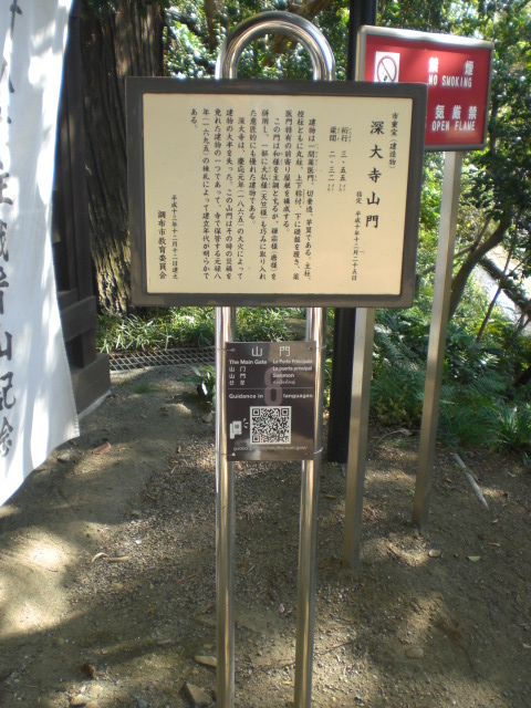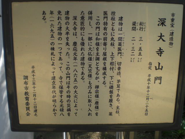 山門の前の西側には、深大寺の門石標識柱が、東側には、解説板が建てられています。