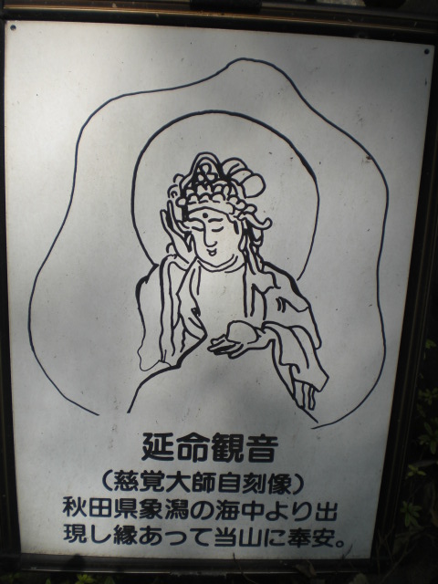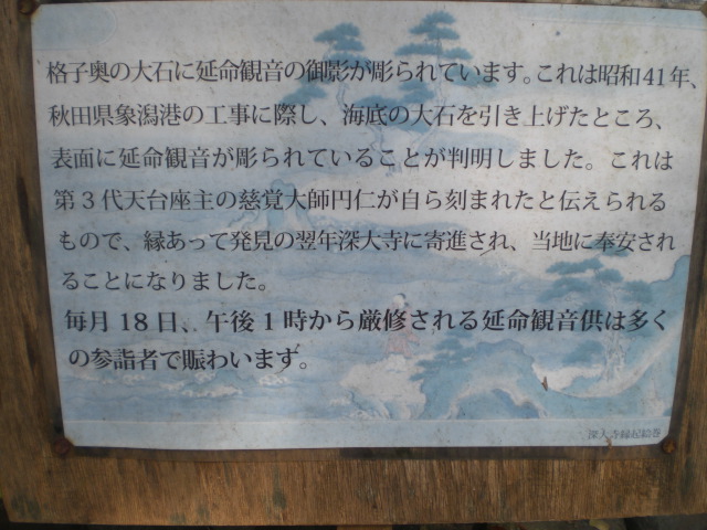 秋田県の象潟港の工事の際、海底の大石から出てきたという、元三大師自彫の延命観音像が祀られています。