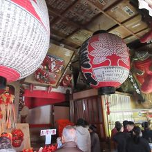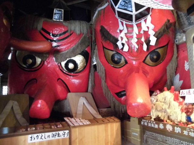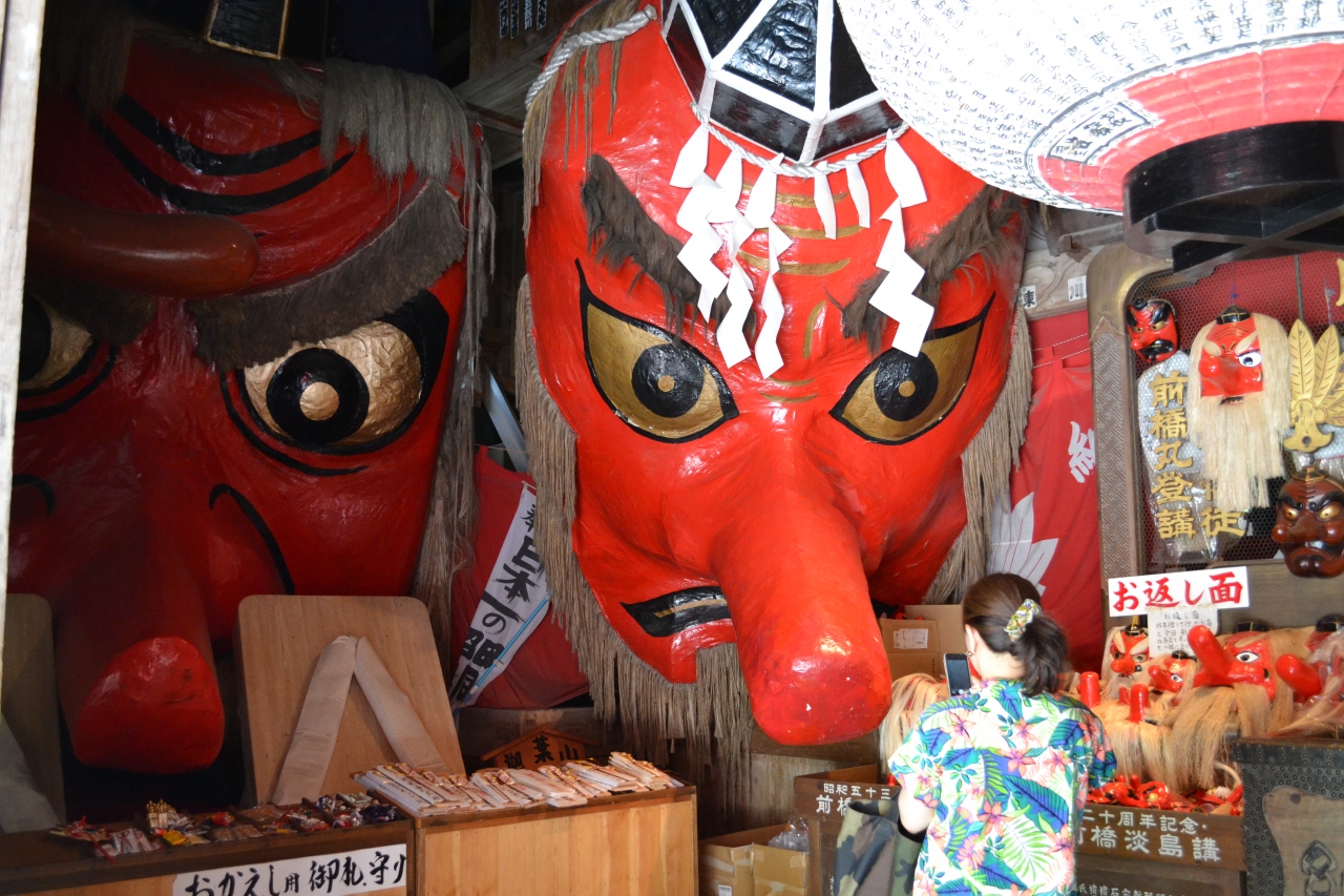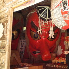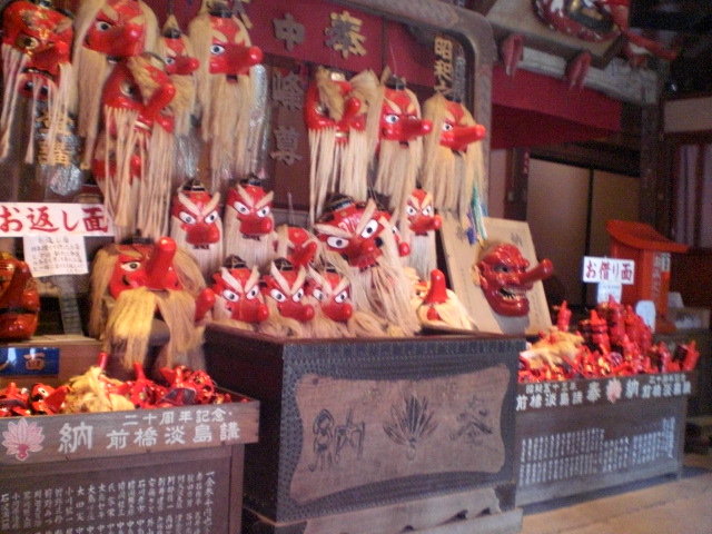 小さなお面を借りて帰り、神棚や仏壇に祭り開運のご利益があり、翌年参道でお礼参りのお面を買う。