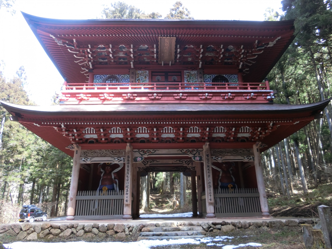 車で訪れたのですが、本堂に向かう途中、車道から少し離れた場所に山門があります。立派な赤い山門で昭和9年から11年にかけて建... 続きを読むてられた比較的新しい山門です。山門にはちょっと漫画チックな「あ・うん」の仁王像があります。