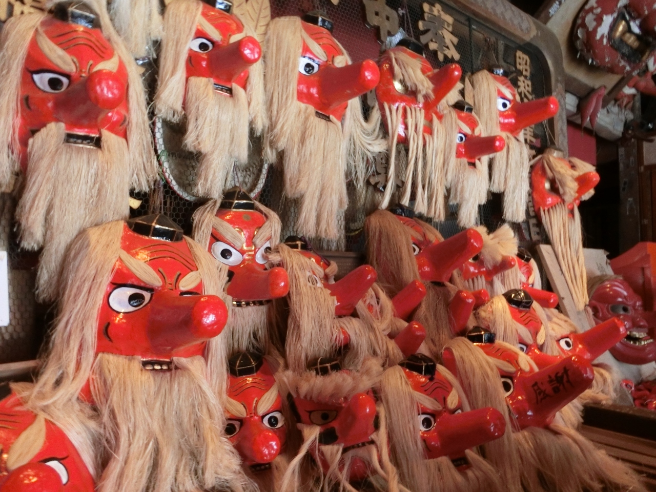 他にも多くの天狗のお面が壁にかかっています。