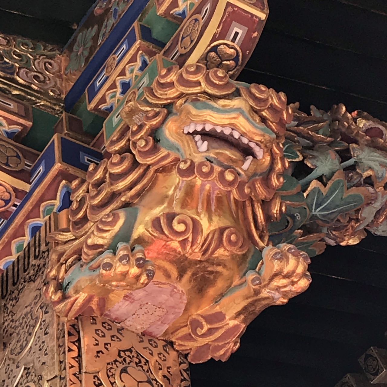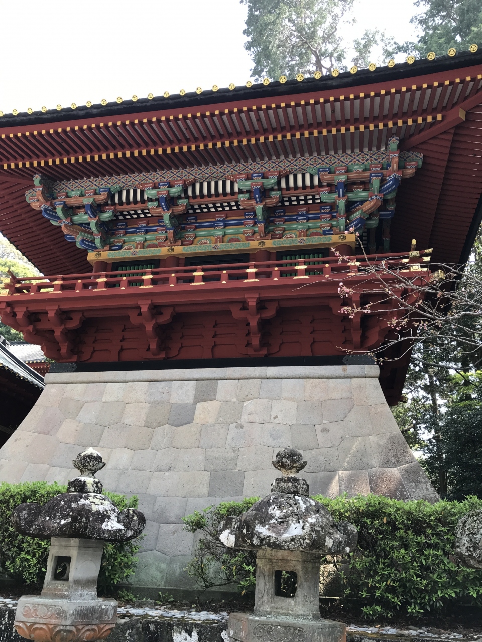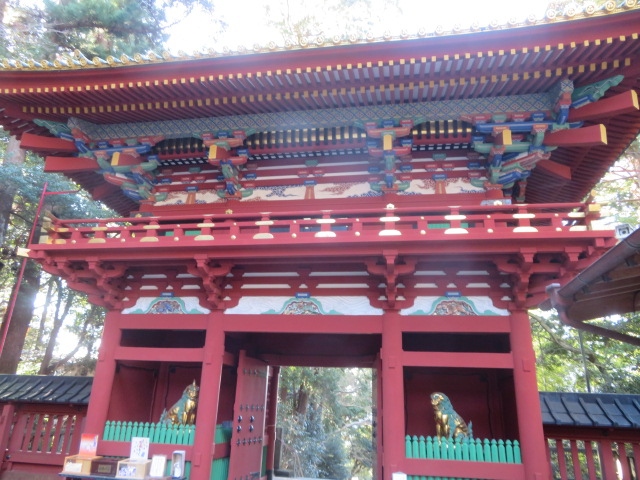 ロープーウェイ駅を降りて石段を登ろうとすると最初に眼前に現れるのが東照宮楼門です。赤塗りの支え部分はどっしりとしており、2...  続きを読む階正面には、御水尾天皇御真筆の「東照大権現」の扁額が周りを威圧するようにかかっています。石段下から見上げると本当にかっこいいんですよ。門を潜って振り返ると2頭の狛犬が本殿を見つめています。また青や緑系の極彩色の漆塗りも圧倒的な力の誇示を感じさせます。家康という稀代の将軍を十分に感じさせてくれるパワースポットです。  閉じる