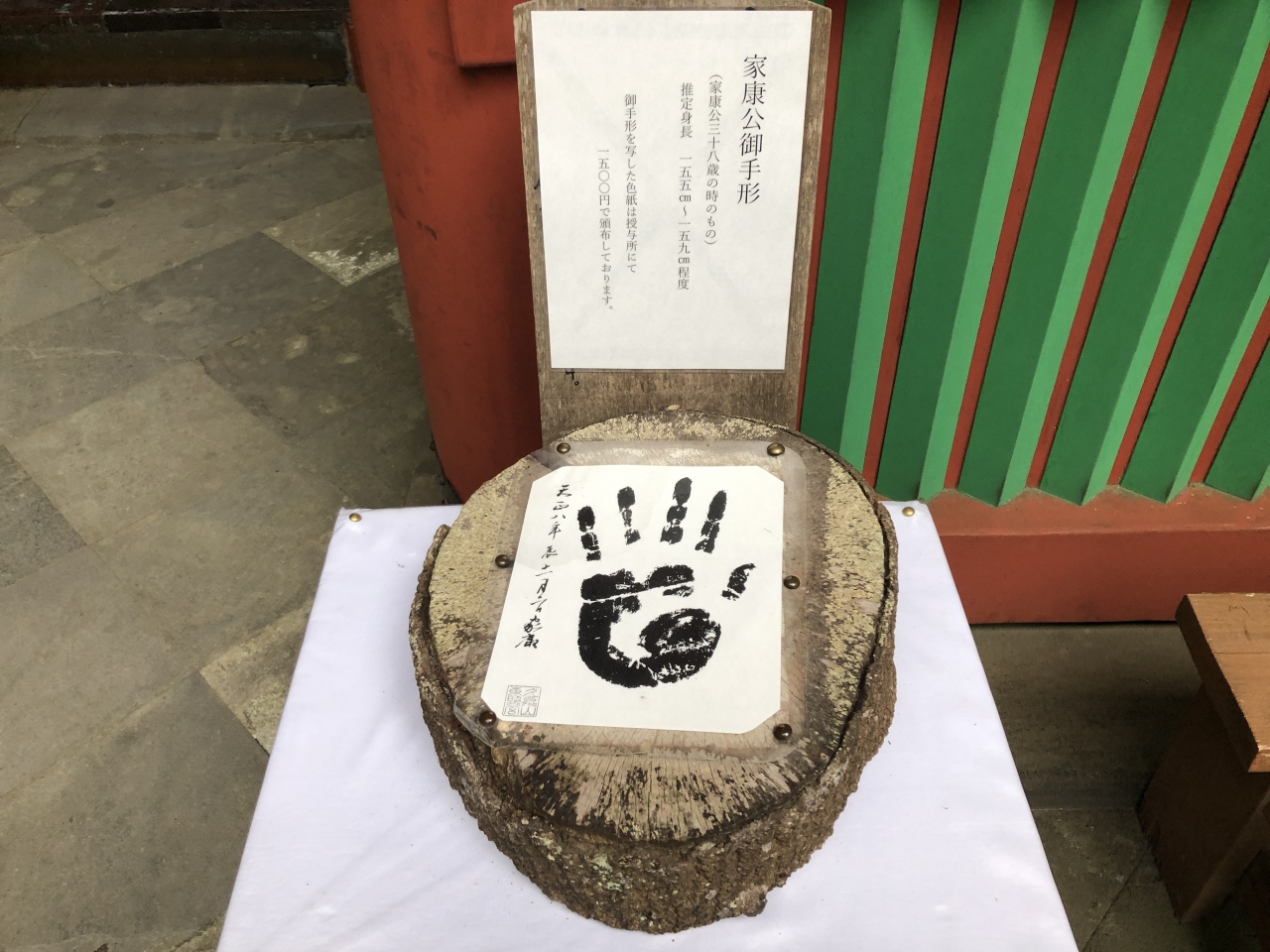 徳川家康公をお祀りする久能山東照宮。その家康公の手形(もちろん複製ですが)が楼門の下に置かれています。けっこう無造作に置い...  続きを読むてありますよ。説明書には「家康公38才時のもの」「家康公の推定身長は155cm~159㎝程度」「手形を写した色紙が1500円」ということが書かれていました。手を触れてはいけないと書いてなかったけど、コロナ時世ゆえ直接触れずにサイズ合わせだけしました。家康公は意外と小さい手だったようです。  閉じる