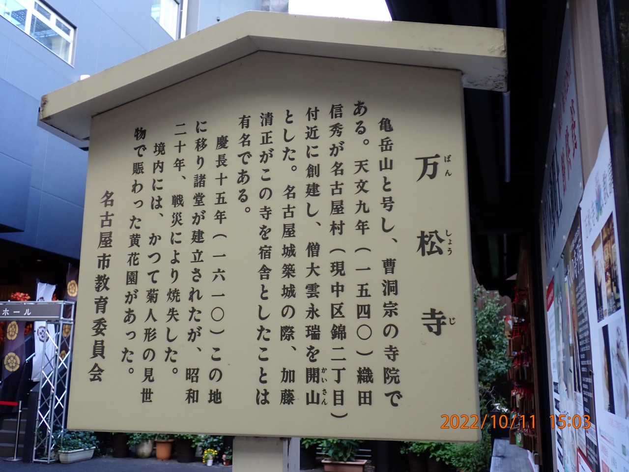 1540年に織田信秀が織田家の菩提寺として開基しました。本尊は十一面観世音菩薩です。徳川家康が3年間万松寺で織田信秀に保護... 続きを読むされて暮らしたこと、1552年に織田信秀の葬儀が万松寺で執り行われた際の織田信長の行動はドラマに取り上げられるくらい有名です。名古屋城築城のため1610年に現在地に移りました。1912年に広大な寺領の大部分を開放したことから大須が大繁華街になりました。不動堂と稲荷堂は周りの商店と違和感ないです。七夕飾りが入口にありゲームセンターかと思ってしまいましたが、寺務所に2、3人の僧侶がいて寺院だと分かりました。参拝者は次々と訪れていました。大須の発展と関りがある寺院です。 閉じる