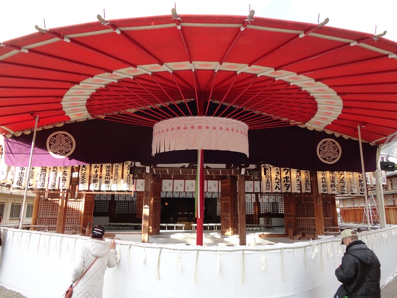 浪速区恵美須西1丁目に鎮座、大阪の商売の神「えべっさん」として信仰を集める神社。推古天皇の時代に聖徳太子が四天王寺を建立した際、同地西方の鎮護神として祀ったのが始まりとされる。祭神は天照皇大神・事代主命(戎さん)・外三神。戎さんはもともと漁業の守り神であり、古代にはこの辺りは海岸沿いで、海・里・野の諸産物が物々交換される「市」が開かれ、その市の守り神としてもこの戎さんが祀られていたそうだ。その後、福徳を授ける神、商業の繁栄を祈念する神としても篤く信仰されるようになった。とくに江戸時代になると、1月9・10・11日の三日間にわたって「十日戎」の祭礼が開催され、宝恵籠の奉納も行われるようになった。現在では、年の最初の祭りとして十日戎の3日間に約100万人を超える参詣者が訪れ、神社から授与される笹がついた小宝・「吉兆」(きっちょう)を買い求め、活気あふれる。