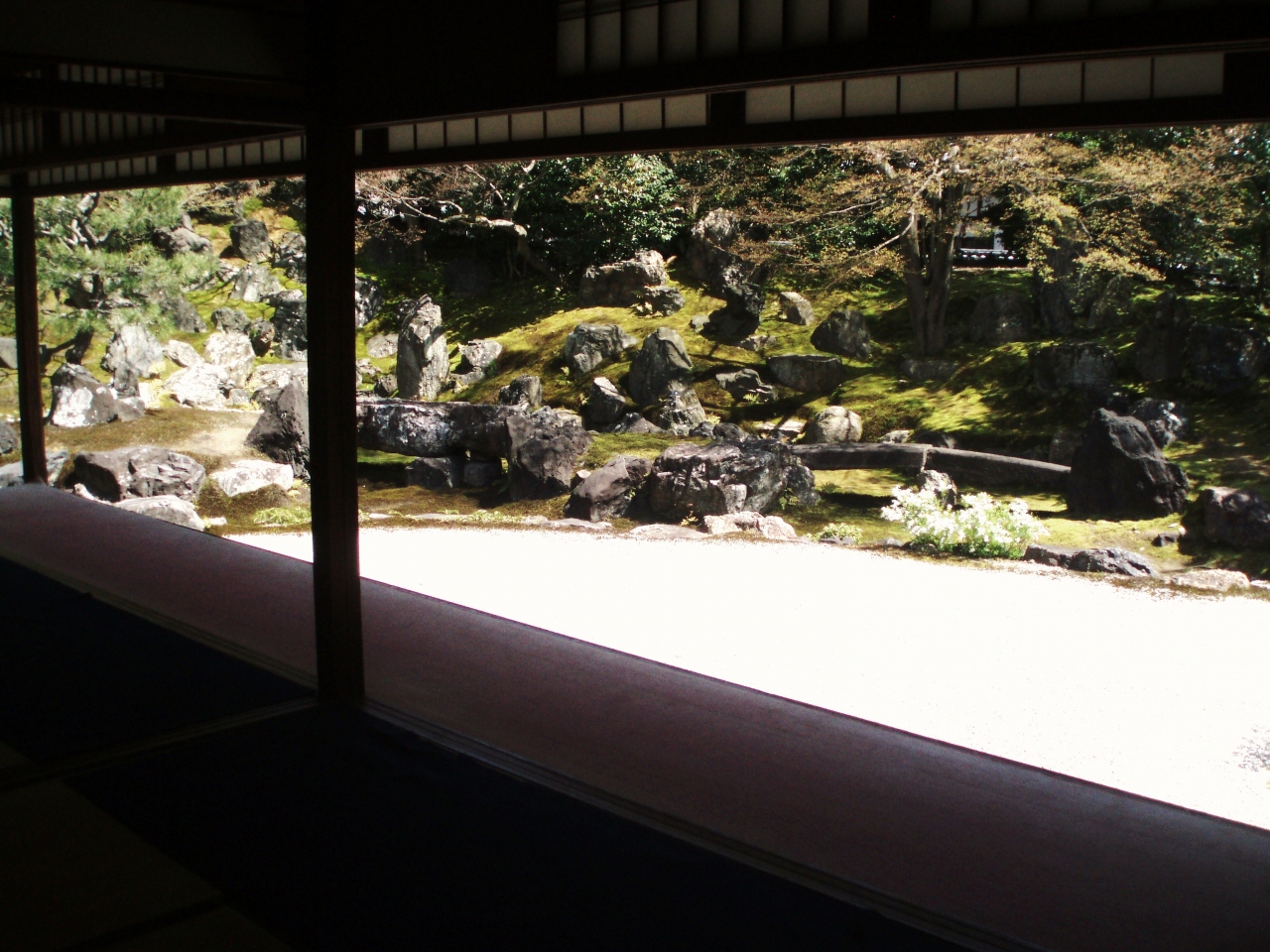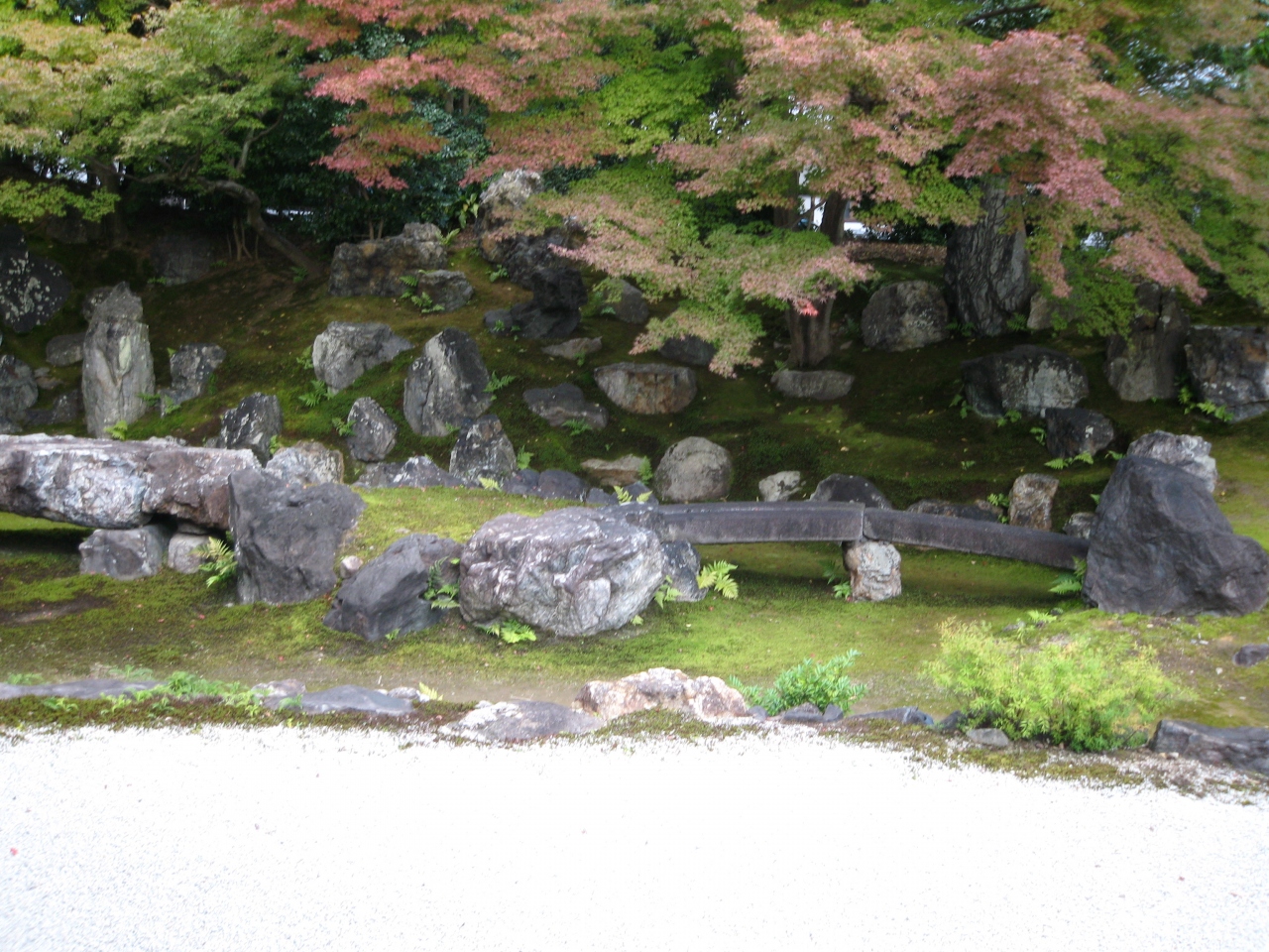 いかにも池に石橋が渡してあるような造りですが、池に水は無く、不思議な感じ。枯池と呼ぶそうで桃山時代の典型的な枯山水だそうです。